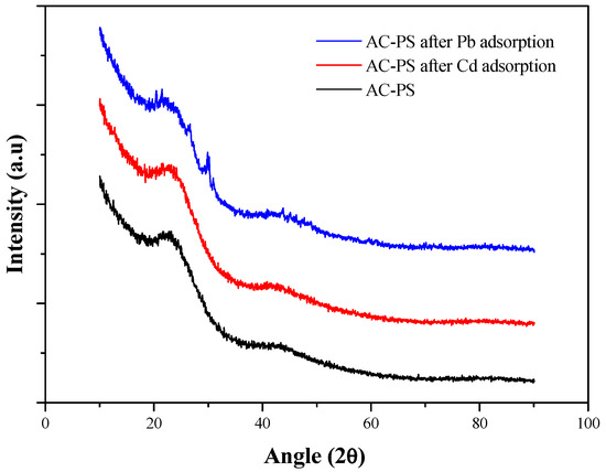 Figure 5 presents the X-ray diffractograms for AC-PS before and after adsorption. Although there is a slight difference in intensity observed in the region between approximately 10° and 25°, the diffractometric data obtained after the adsorption process for both lead and cadmium show great similarity with those obtained before the process, suggesting that there were no changes in the carbon structure; the diffractograms presented two prominent closely situated in the same region (22° and 42°), corresponding to the crystallographic planes (002) and (101), respectively, observed in similar materials [32,33]. The crystalline structure of the AC-PS obtained in this work can be attributed to a hexagonal structure typical of carbon-based materials. In this structure, the adjacent crystallographic planes (002) and (101) are separated by interplanar distances equal to 3.827 Å and 2.107 Å, respectively.