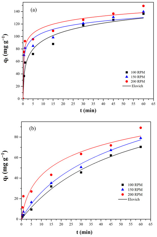 To better understand the kinetic behavior of the adsorption, the pseudo-first order, pseudo-second order, and Elovich models were fitted to experimental data (Figure 5). The kinetic parameters for lead and cadmium adsorption are shown in Table 2 and Table 3, respectively. For lead (Table 2), the only model that presented a good fit to experimental data was the Elovich model. For cadmium (Table 3), on the other hand, all the kinetic models used presented a good fit. However, due to the lower relative average error values, the Elovich model was chosen to describe experimental data. Elovich parameters show that the initial adsorption rate (a) of Pb(II) at 200 rpm is higher than that of Cd(II), confirming the faster uptake of lead. Similarly, the b parameter, which reflects the extent of surface coverage, is substantially larger for Pb(II) than for Cd(II). Regarding the effect of agitation, both a and b increase with increasing stirring rate, demonstrating that higher agitation (200 rpm) favors adsorption by reducing the external mass transfer resistance.