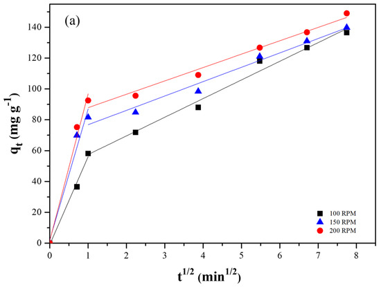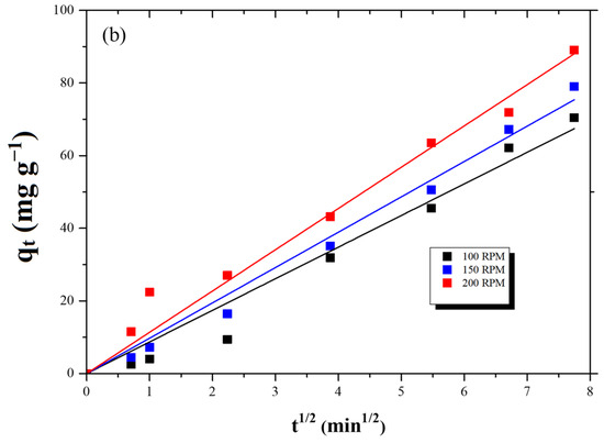 The Weber–Morris model was used to evaluate the film and intraparticle diffusion steps of adsorption over time, and the effect of the stirring rate on each step. Weber and Morris graphs for the adsorption of lead and cadmium at the three agitation rates studied are shown in Figure 7a and Figure 7b, respectively. For Pb(II), the plots clearly exhibit two distinct linear regimes, indicating that both film diffusion (external mass transfer) and intraparticle diffusion contribute to the overall adsorption process. The initial, steeper linear segment corresponds to film diffusion, where Pb(II) ions are transported from the bulk solution to the external surface of the AC-PS. For Cd(II), however, for each agitation rate, only one dominant linear segment was verified. This suggests that for cadmium, intraparticle diffusion is the primary rate-controlling step throughout the adsorption operation, or that film diffusion is so rapid that it does not present a distinct rate-limiting phase compared to intraparticle diffusion.