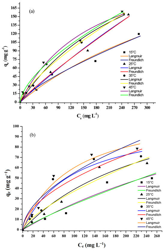The equilibrium adsorption isotherms for lead and cadmium on AC-PS were determined at 15 °C, 25 °C, 35 °C, and 45 °C, employing initial solution concentrations of 25, 50, 100, 200, and 300 mg L−1 for both lead and cadmium. The corresponding curves are illustrated in Figure 8a,b. The results show that equilibrium adsorption capacity values increased with the increase in temperature. The highest values were around 150 mg g−1 and 80 mg g−1 for lead and cadmium, respectively, and were obtained at 45 °C. These results suggest that the adsorption of both lead and cadmium on AC-PS was endothermic. This increase in adsorption capacity with temperature is related to the diffusion and accessibility of ions into the porous structure, as well as their interactions with surface functional groups.