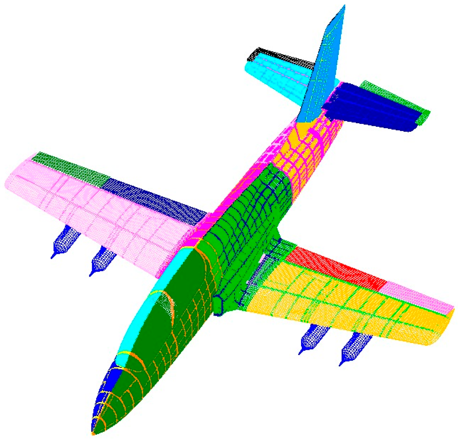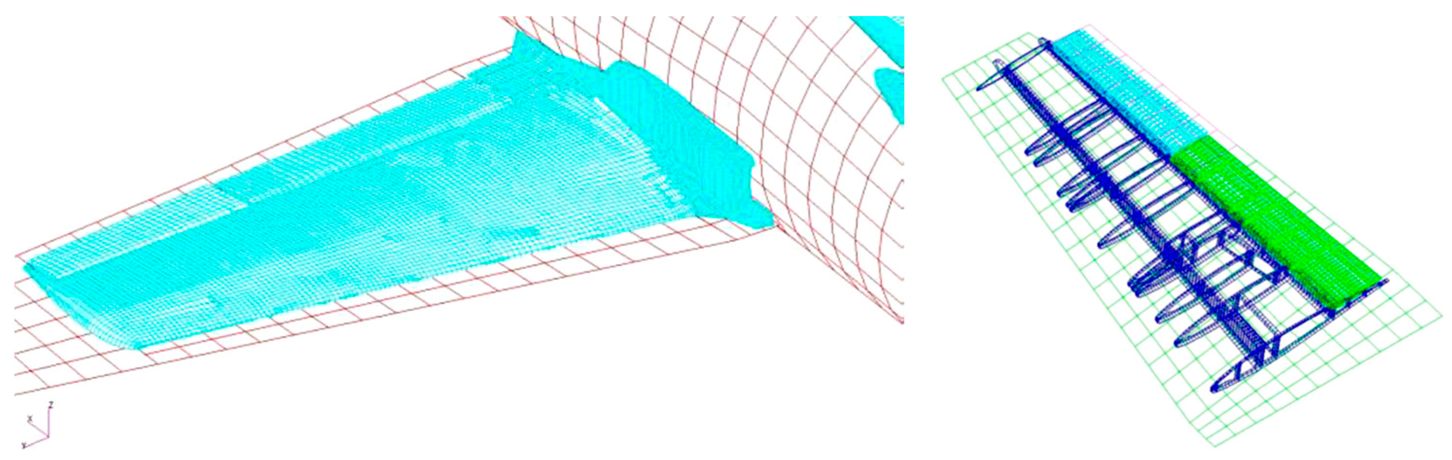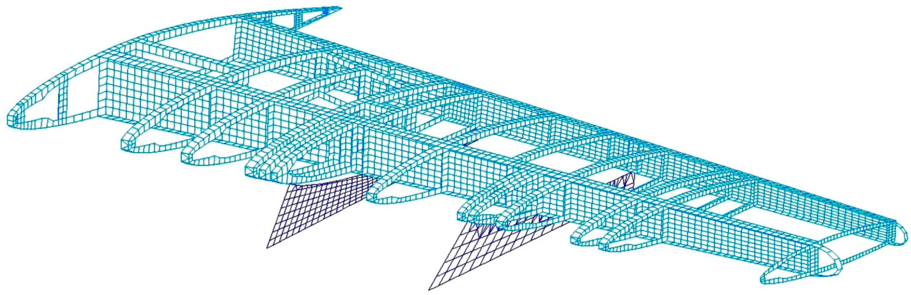 Overall, the global FEM contained 565,551 nodes and 584,794 elements, of which 558,630 were quadrilateral (CQUAD4) and 26,164 triangular (CTRIA3), providing a robust balance between computational efficiency and accuracy. This detailed discretization ensured that the model had sufficient degrees of freedom to reproduce both the global elastic behavior and the local stress concentrations required for aeroelastic and flutter analyses.
