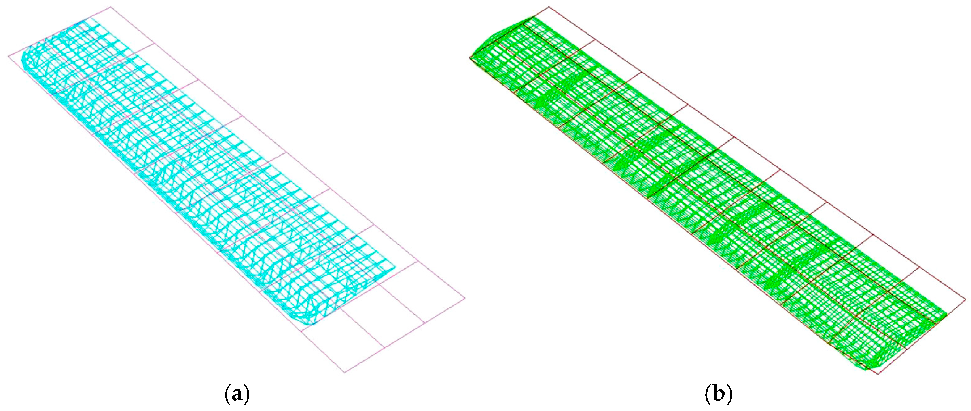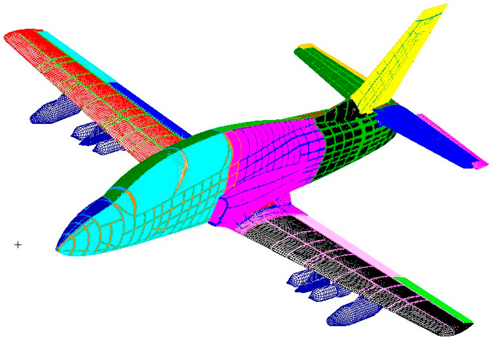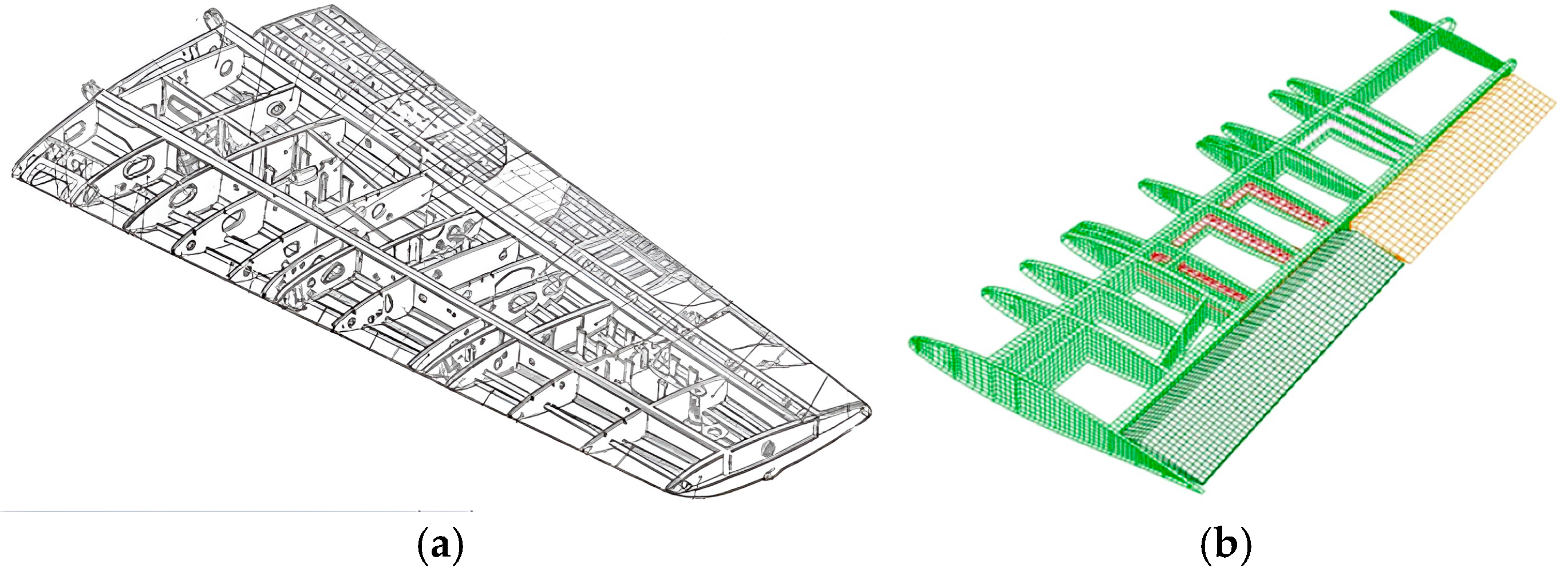 Overall, the global FEM contained 565,551 nodes and 584,794 elements, of which 558,630 were quadrilateral (CQUAD4) and 26,164 triangular (CTRIA3), providing a robust balance between computational efficiency and accuracy. This detailed discretization ensured that the model had sufficient degrees of freedom to reproduce both the global elastic behavior and the local stress concentrations required for aeroelastic and flutter analyses.