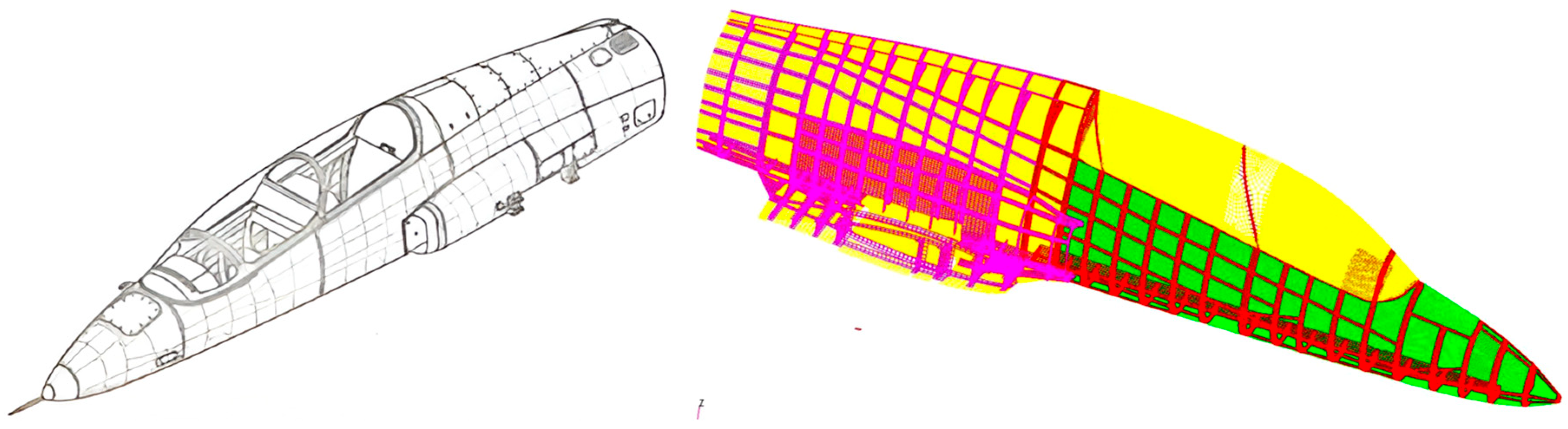 The fuselage is built as a semi-monocoque metallic structure with frames and longerons ensuring rigidity. In the FEM model, the skin is meshed with regular quadrilaterals, while higher density elements are placed near cut-outs and reinforcement zones. The real structure shows the load-carrying frames and stiffened panels. In the FEM representation, shell elements reproduce the skin while beam elements model the internal structure, ensuring accurate stiffness and load transfer. The forward fuselage includes the cockpit and nose section. The FEM mesh is finer around the canopy and avionics bay, where geometric discontinuities increase stress concentrations. The canopy consists of metallic frames and Plexiglas panels. Its mesh combines shell and solid elements, with denser discretization in curved areas to reproduce transparency panels and load transfer through the frame.