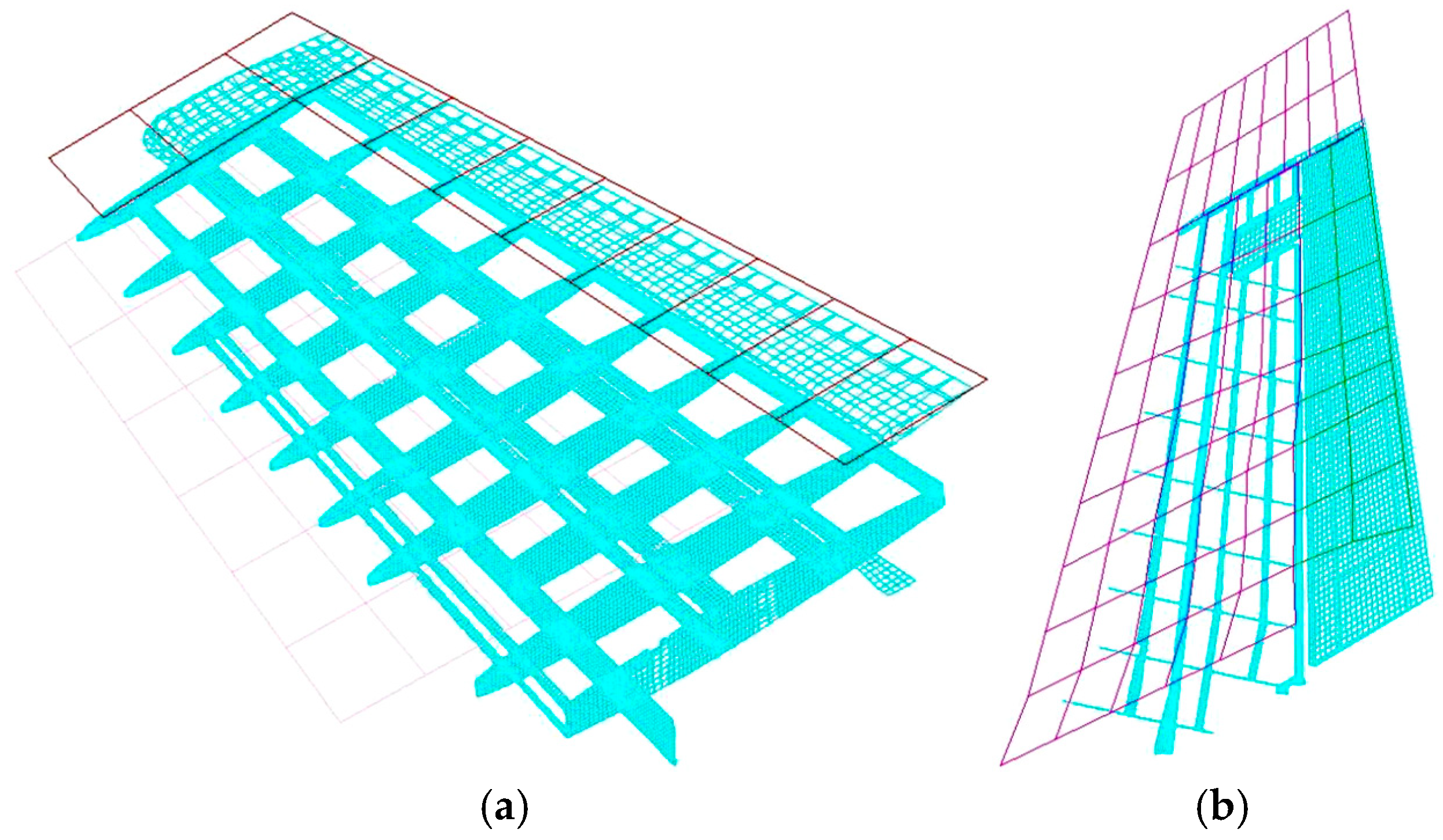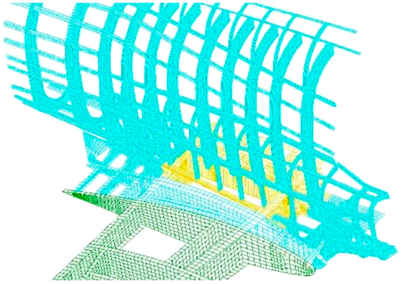 In the following Figure 2, Figure 3, Figure 4, Figure 5, Figure 6 and Figure 7, the FEM is shown without the external skins for clarity, and both the real structural assemblies and their corresponding finite element meshes are illustrated. This comparative presentation emphasizes how the physical geometry was transferred into the numerical model for aeroelastic analysis.