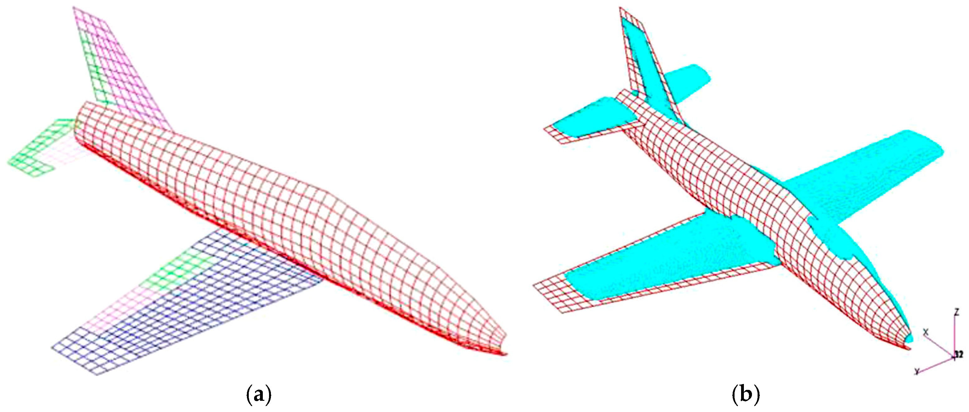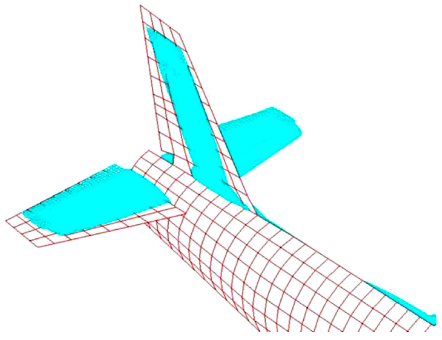 All aerodynamic surfaces and bodies considered (wing, horizontal/vertical tail, fuselage) were assigned penalizations/interference-body definitions. Inputs for lifting surfaces are chord and span; for thin-bodies (fuselage), the inputs are length and thickness distributions. The coverage rule specified that lifting surfaces and thin-bodies must fully cover the geometry used in the aircraft’s FEM structural model to ensure a consistent aeroelastic coupling.