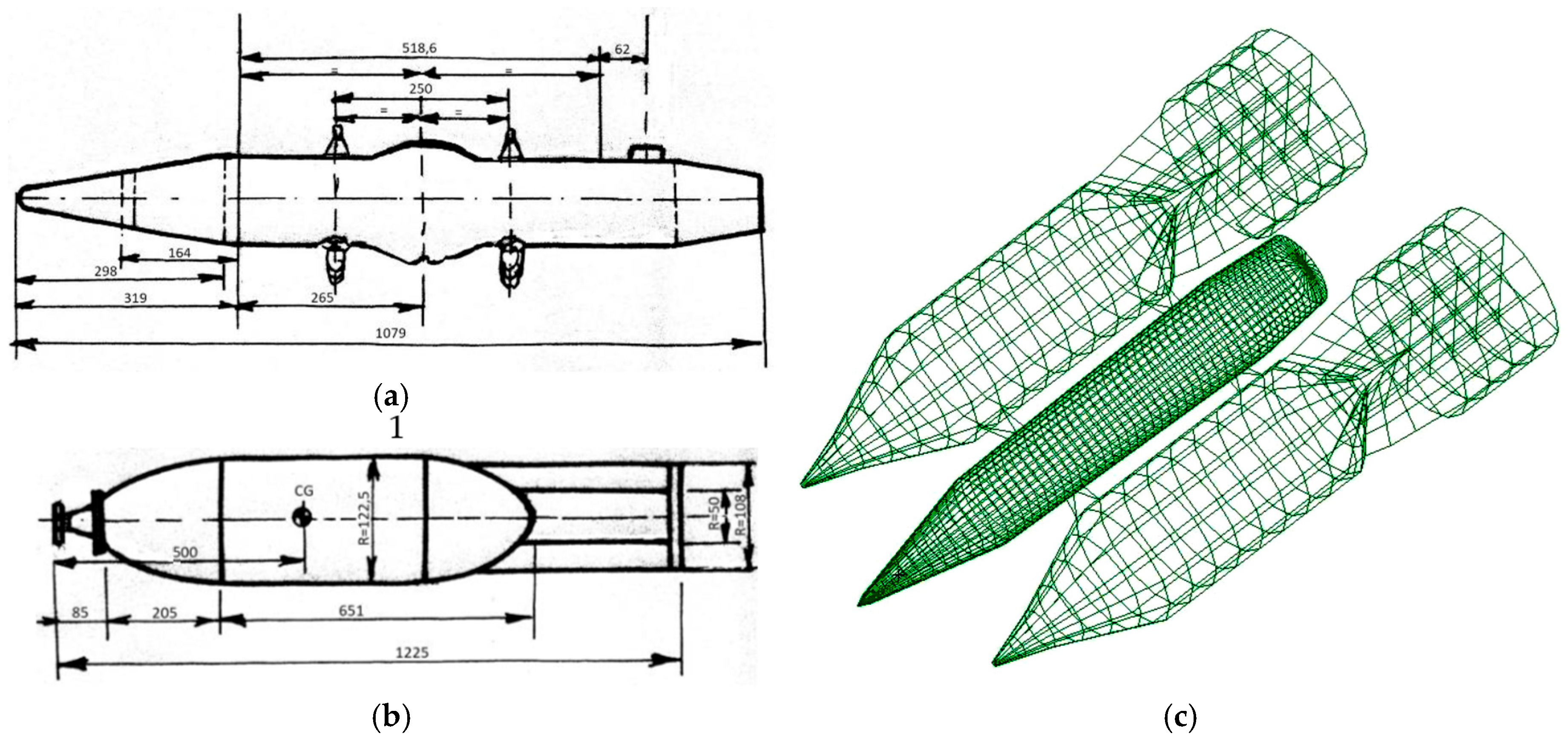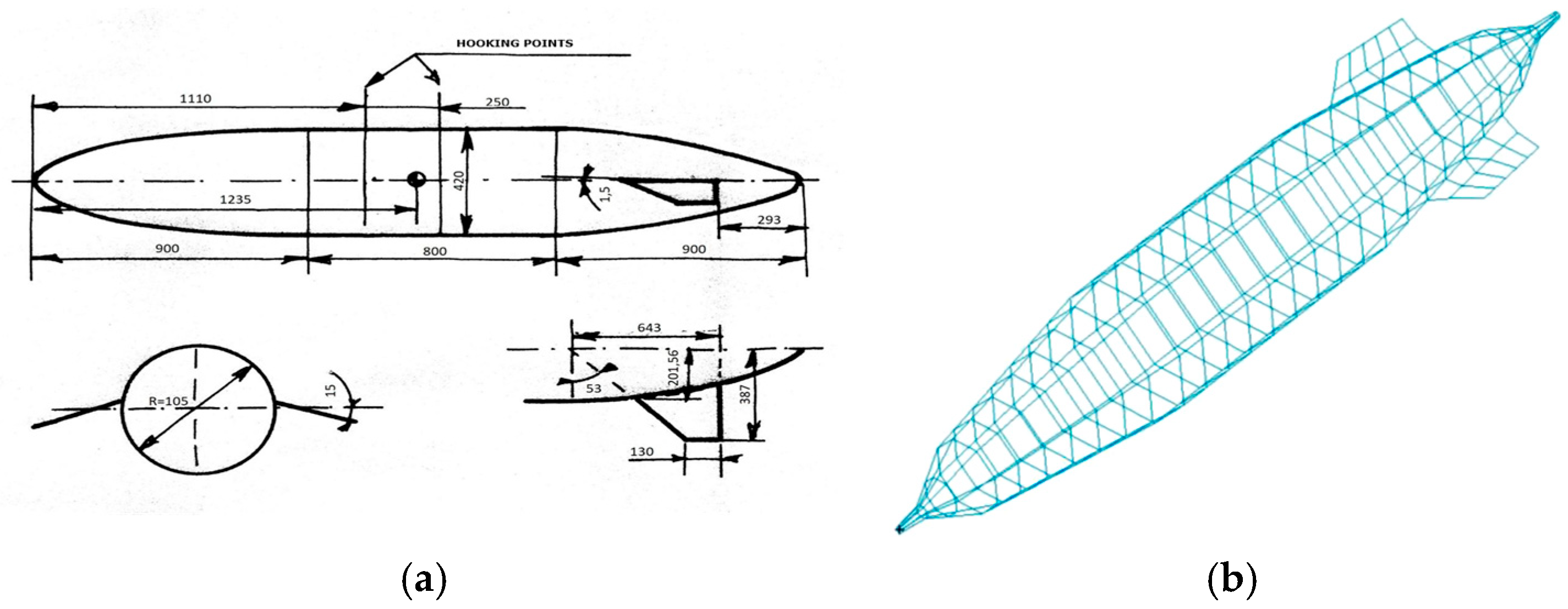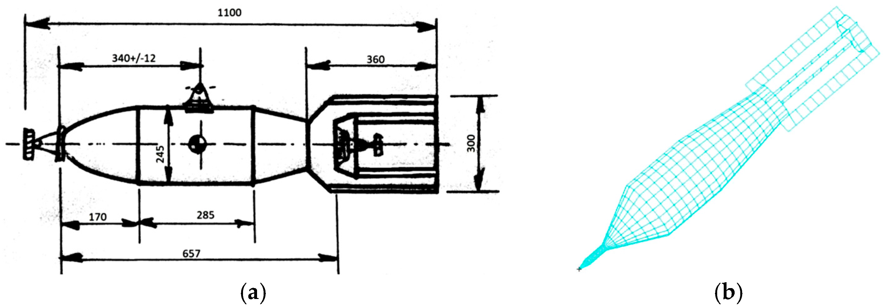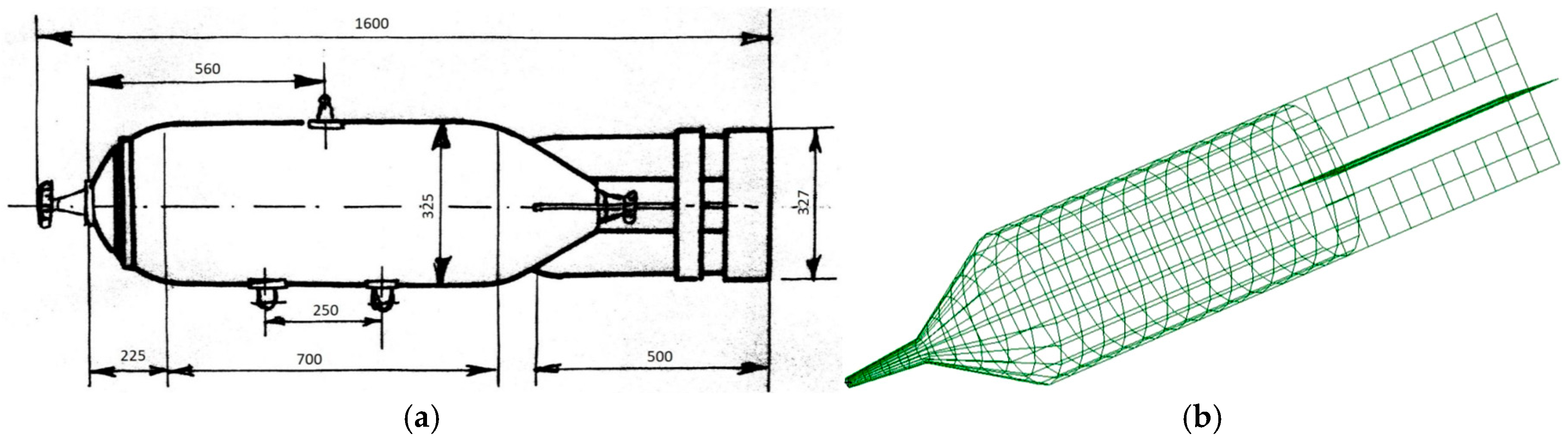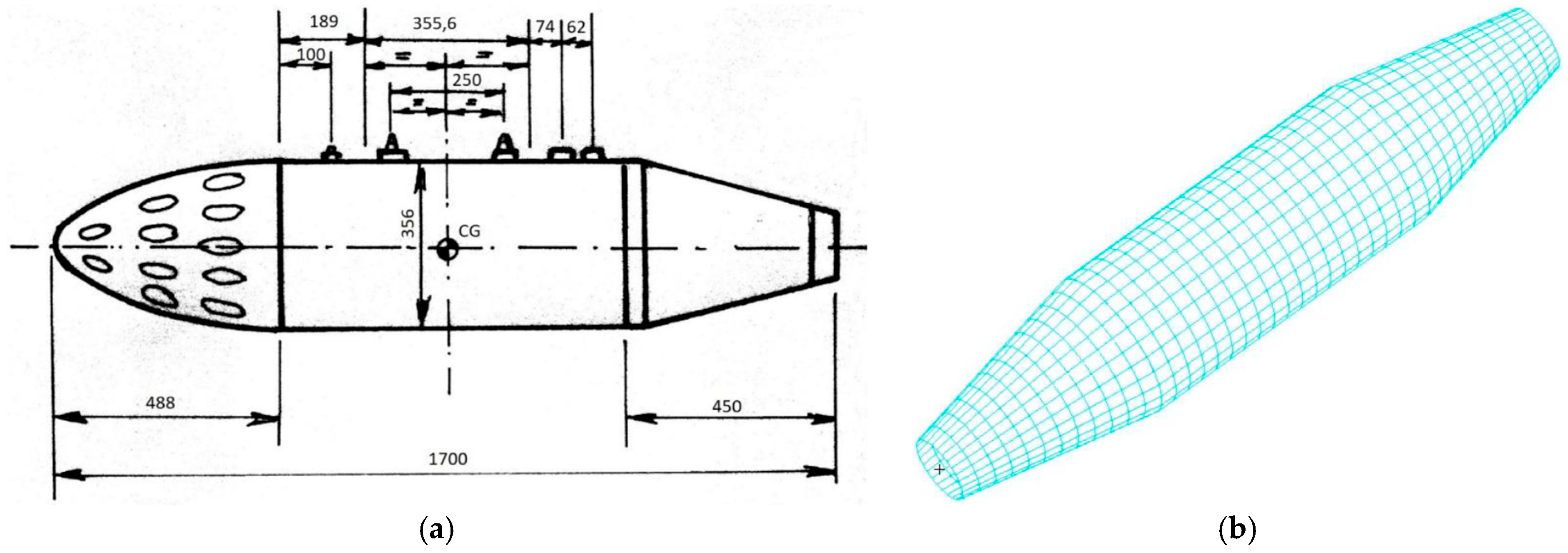 Figure 16. B-50 high-explosive aerial bomb—mounted view and dimensions (a), FEM model (b).