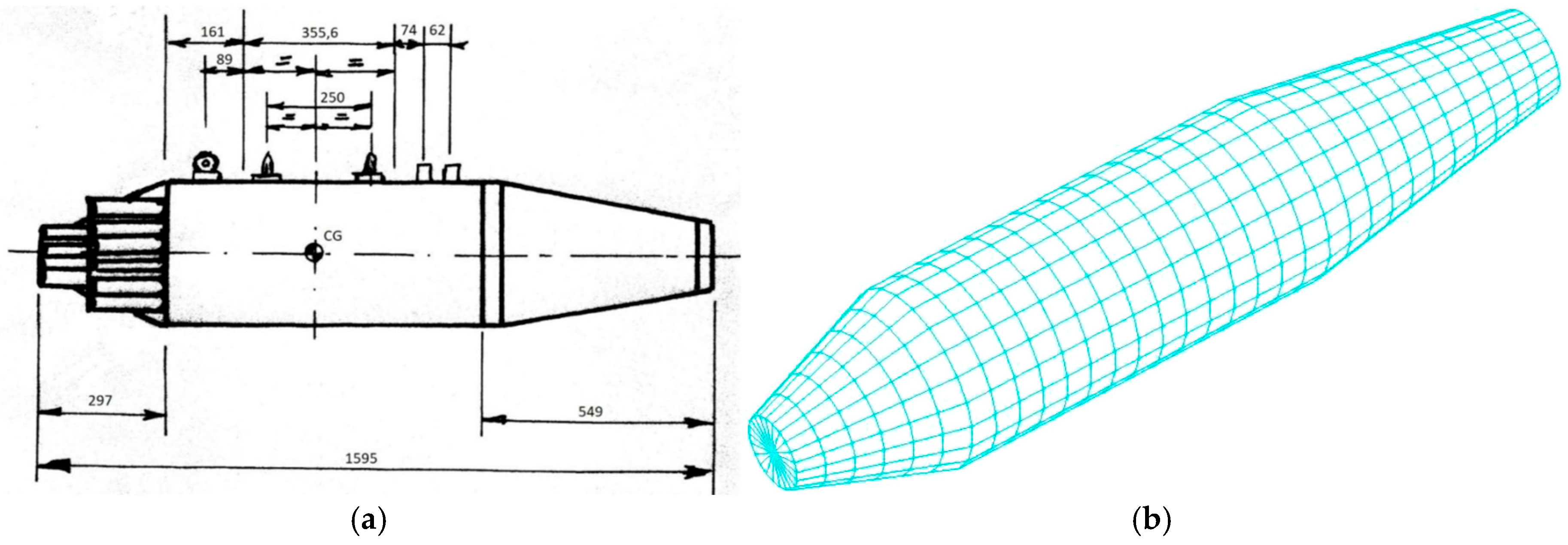 Figure 15. B-250 aerial bomb—mounted view and dimensions (a), and FEM model (b).