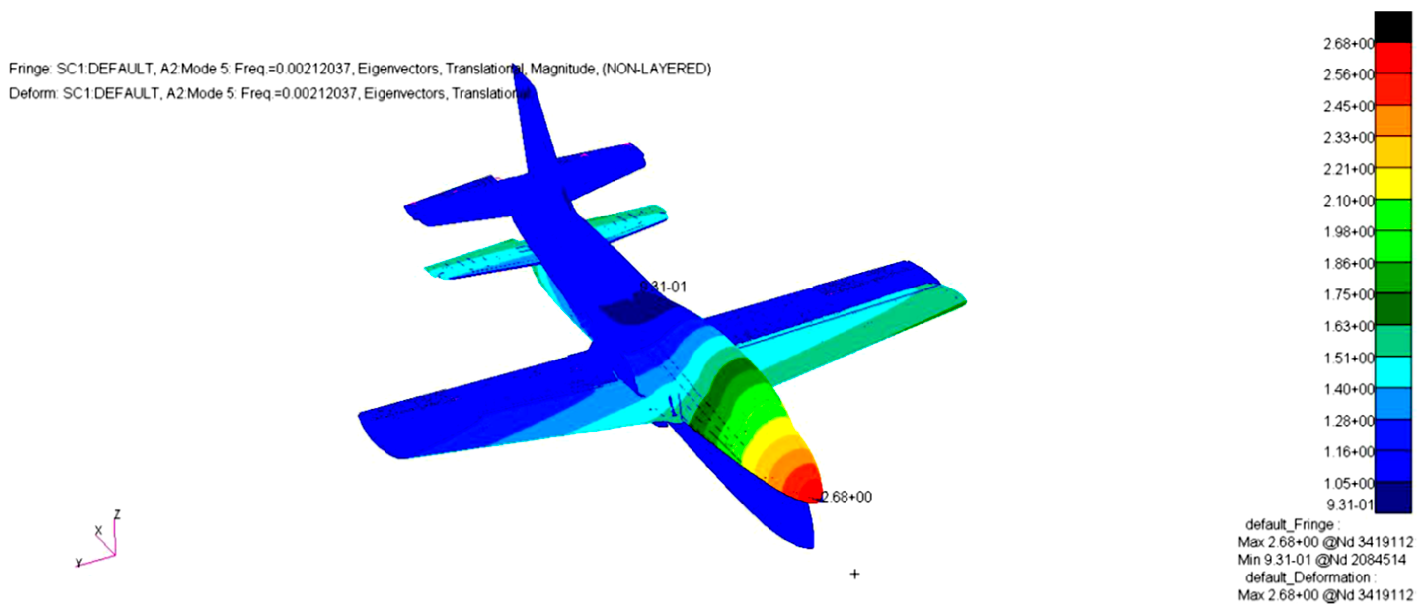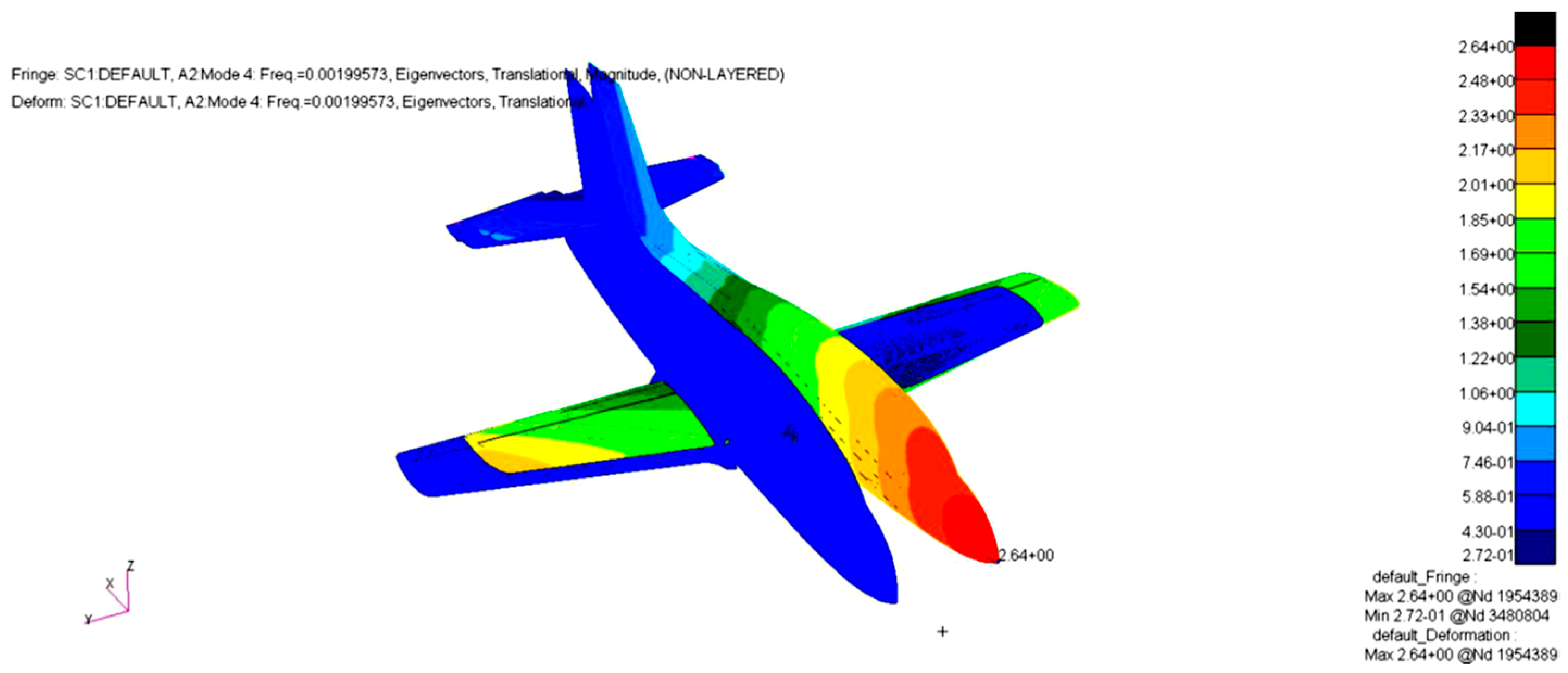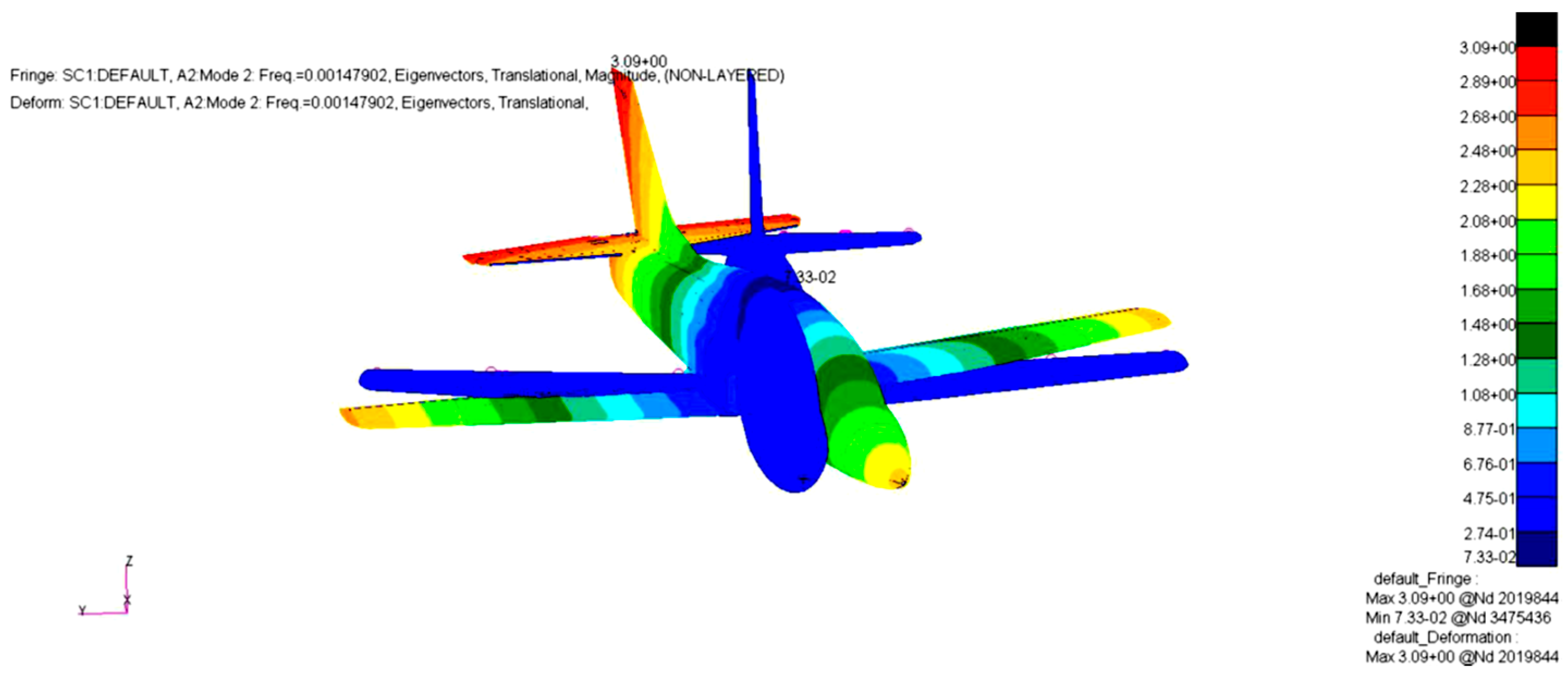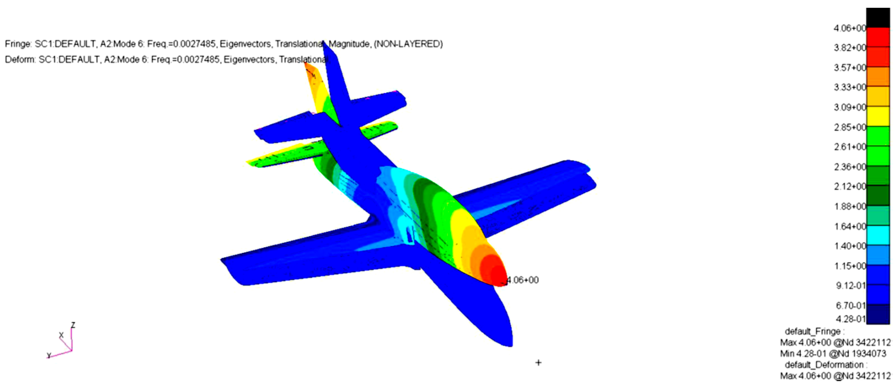 The structural model was verified under free–free boundary conditions to ensure the presence of the six rigid-body modes, and a WEIGHTCHECK audit (mass/C.G./inertia) was carried out to screen for inconsistencies in materials and element properties. The modal basis retained for aeroelastic coupling includes the fundamental elastic modes of wing and empennages as well as control surface modes.