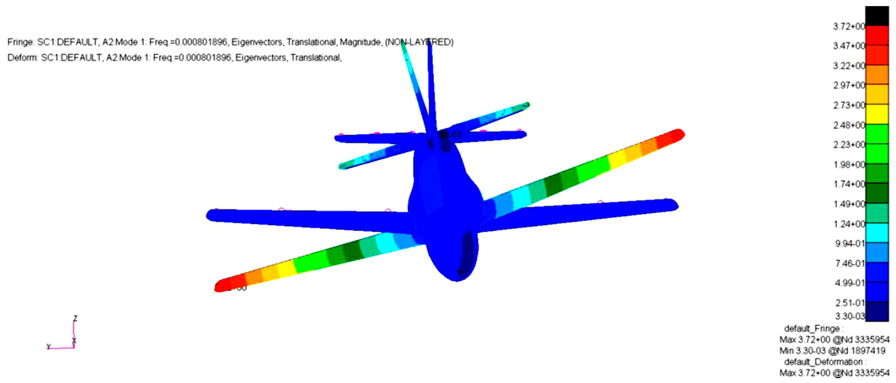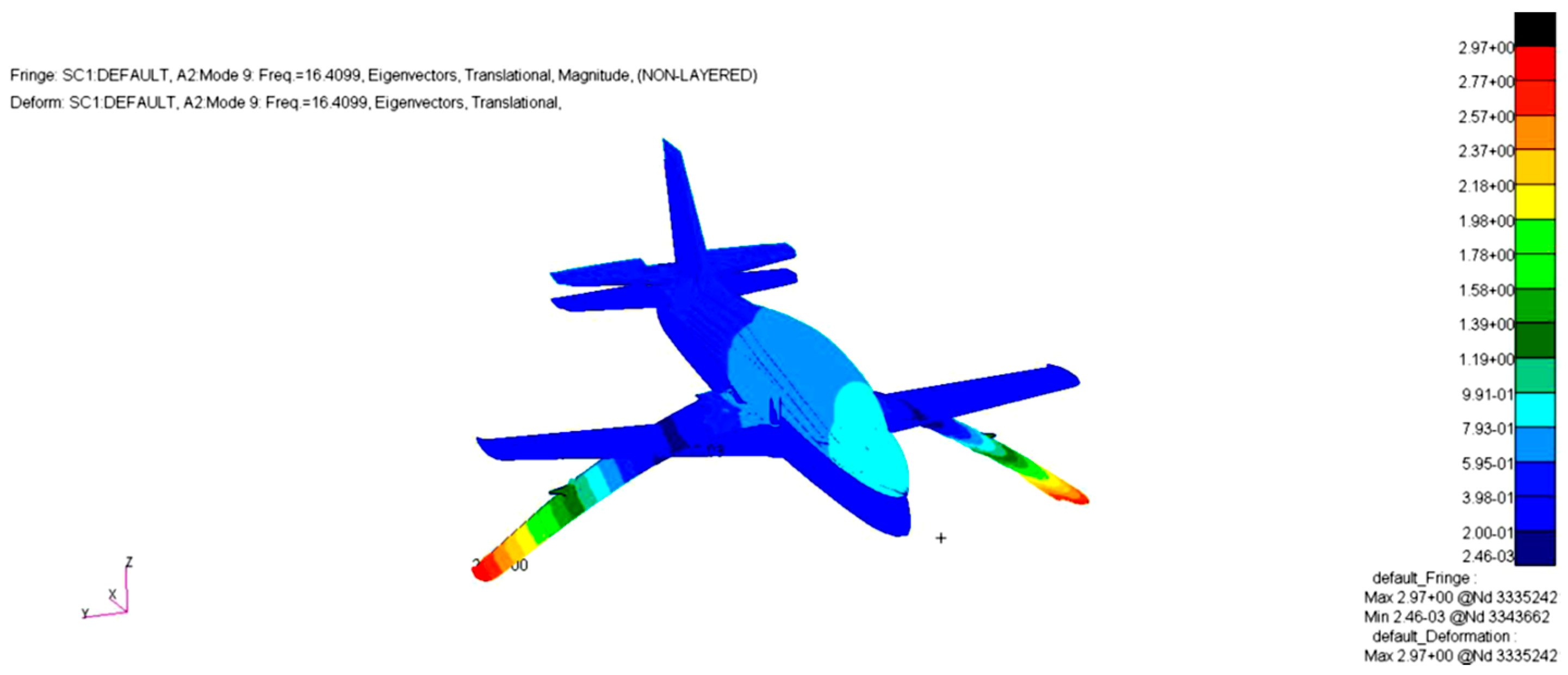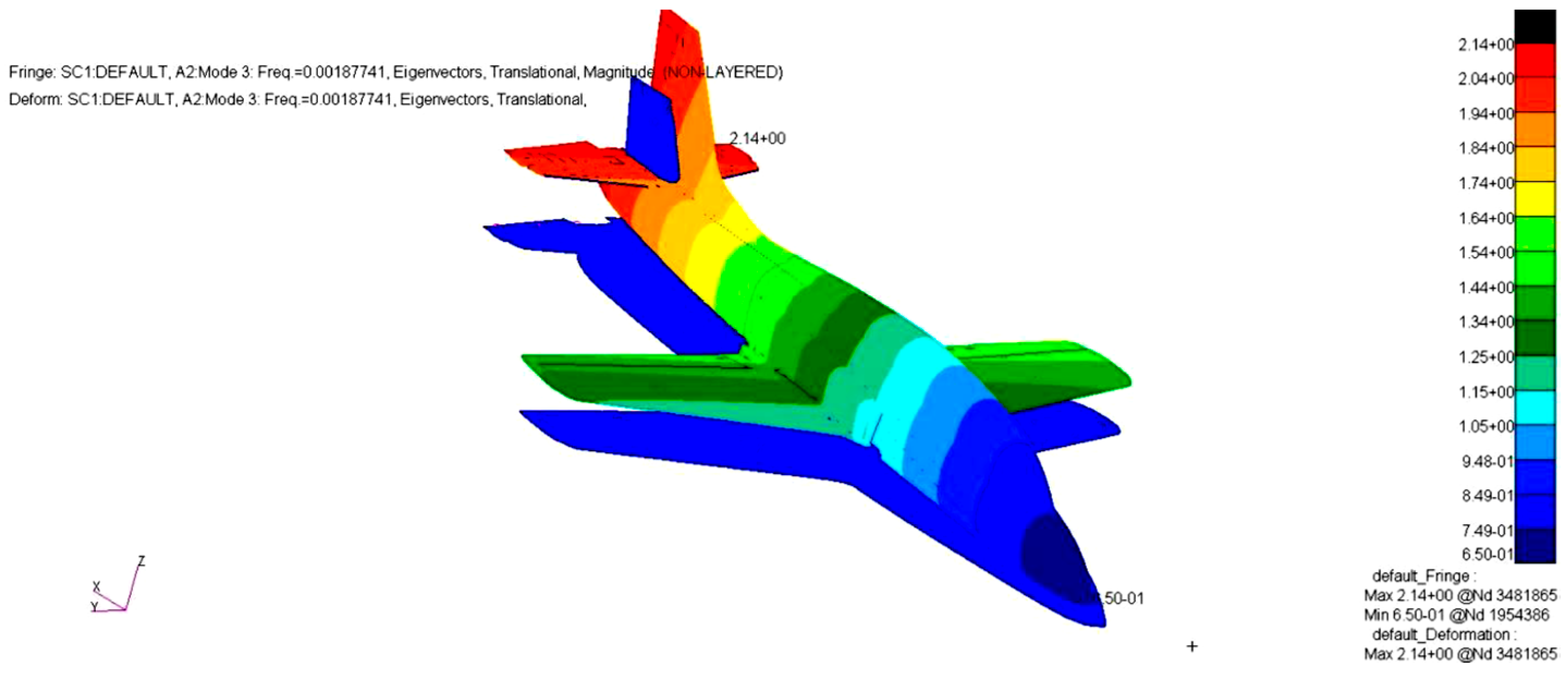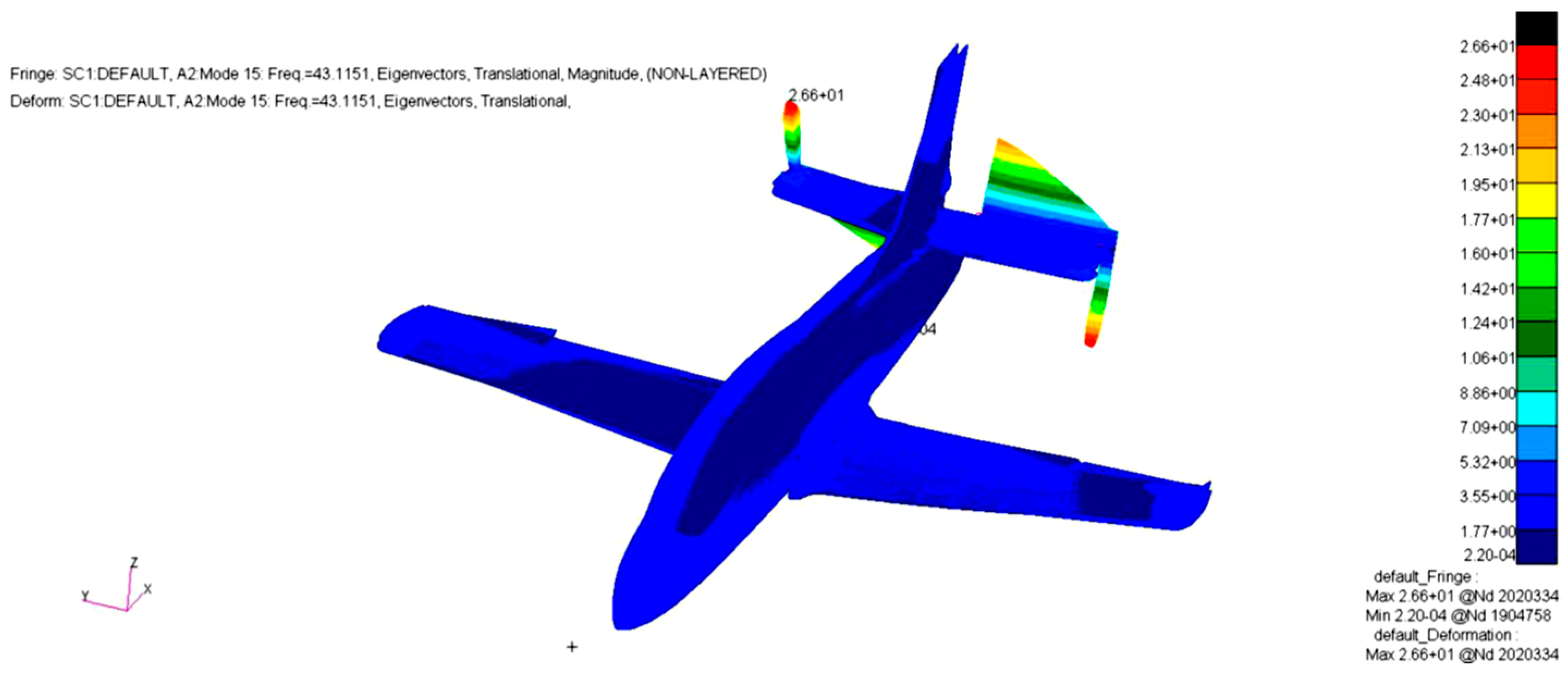 The structural model was verified under free–free boundary conditions to ensure the presence of the six rigid-body modes, and a WEIGHTCHECK audit (mass/C.G./inertia) was carried out to screen for inconsistencies in materials and element properties. The modal basis retained for aeroelastic coupling includes the fundamental elastic modes of wing and empennages as well as control surface modes.