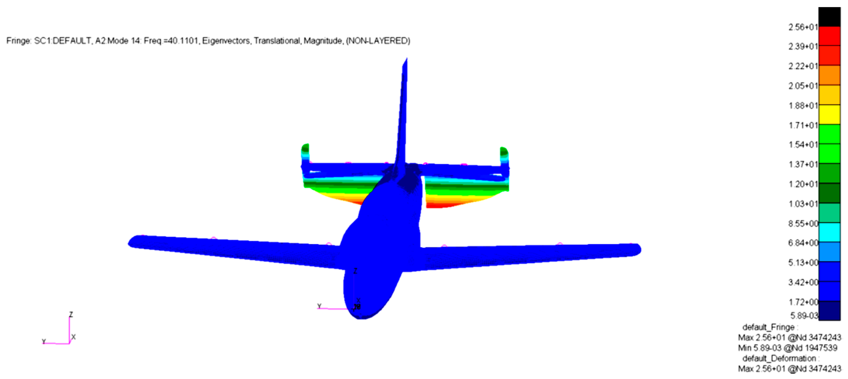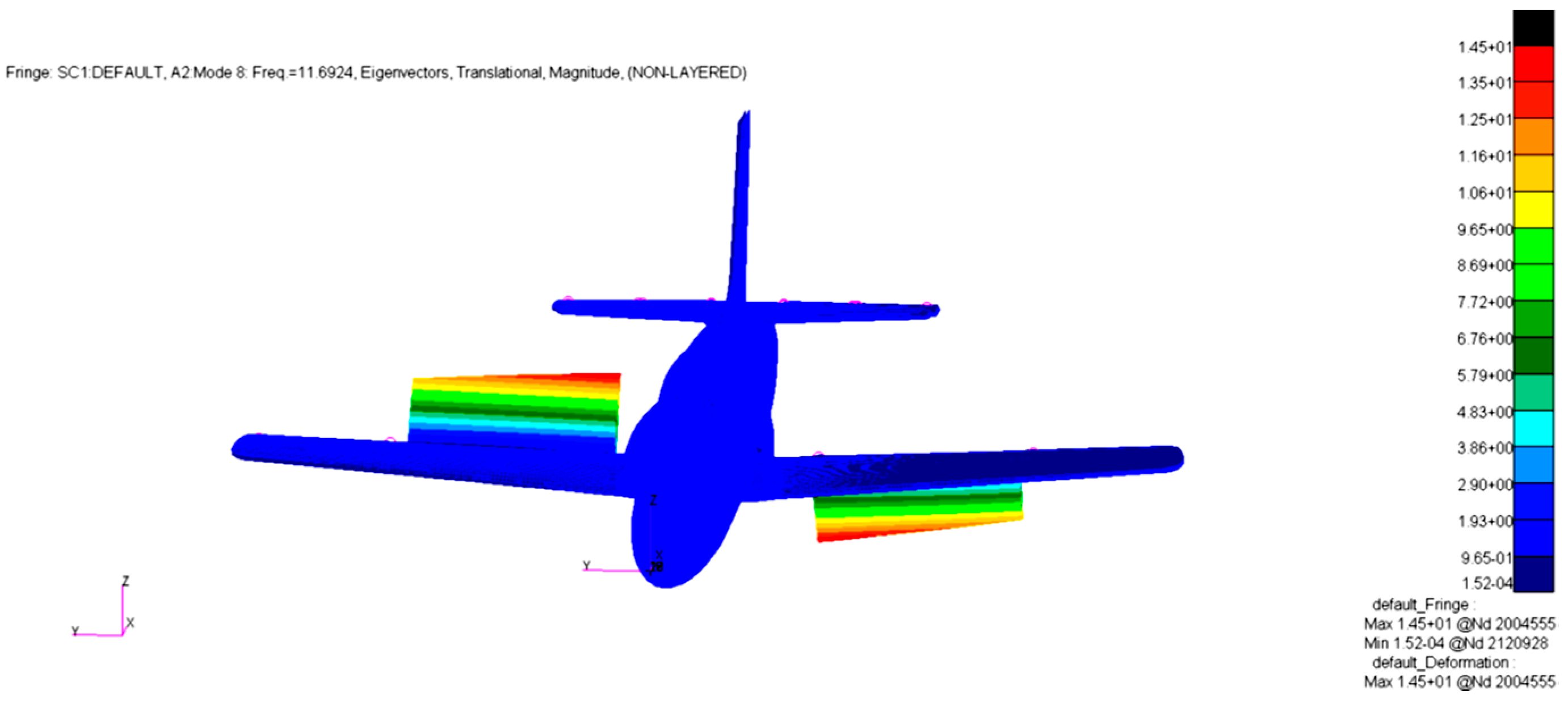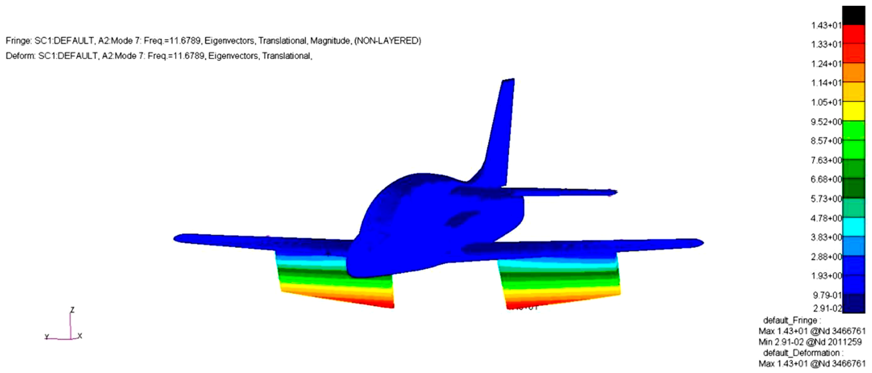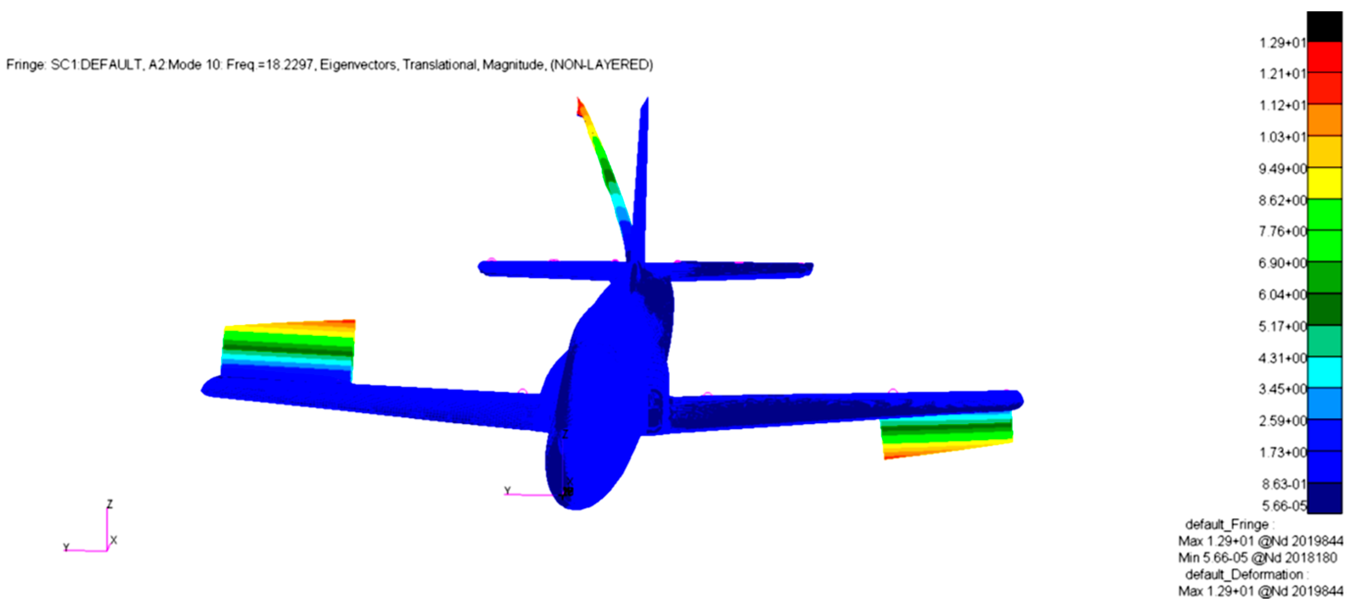 The structural model was verified under free–free boundary conditions to ensure the presence of the six rigid-body modes, and a WEIGHTCHECK audit (mass/C.G./inertia) was carried out to screen for inconsistencies in materials and element properties. The modal basis retained for aeroelastic coupling includes the fundamental elastic modes of wing and empennages as well as control surface modes.