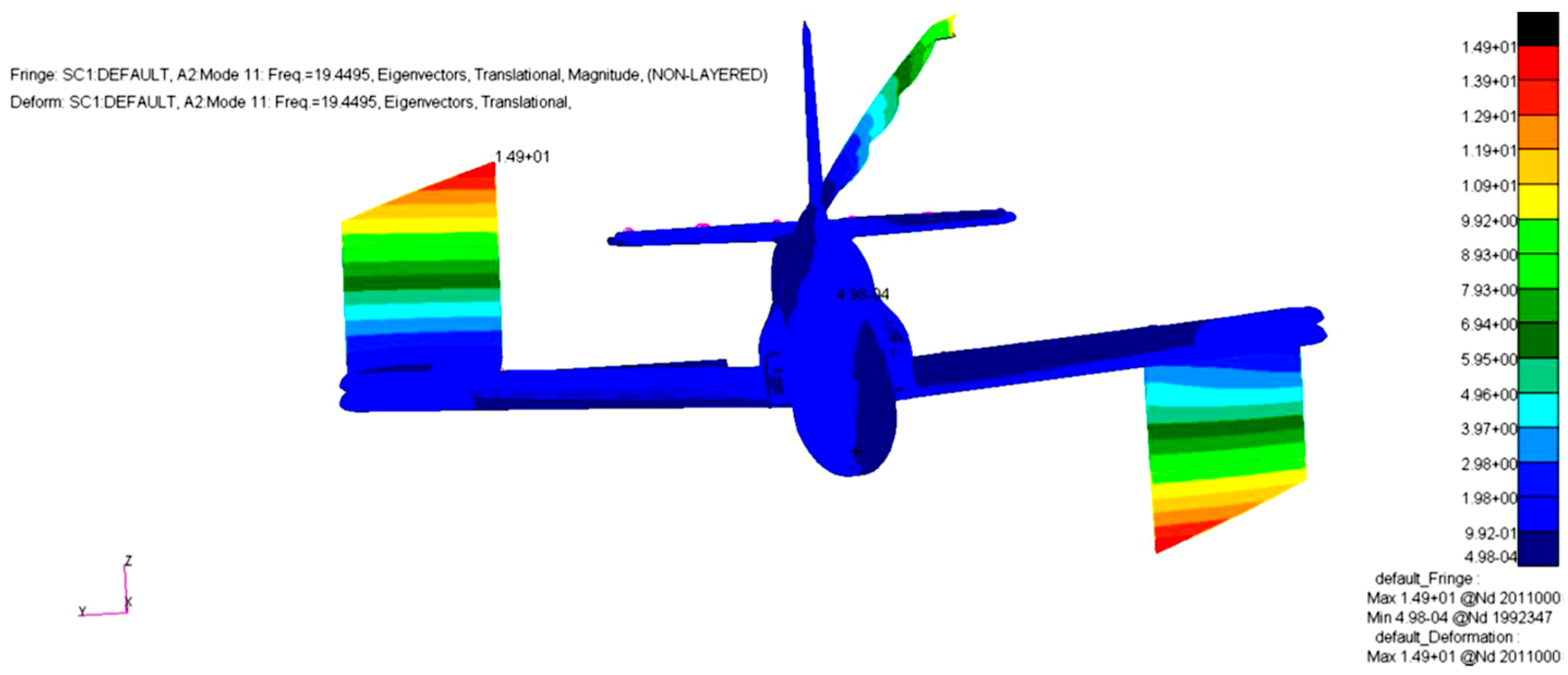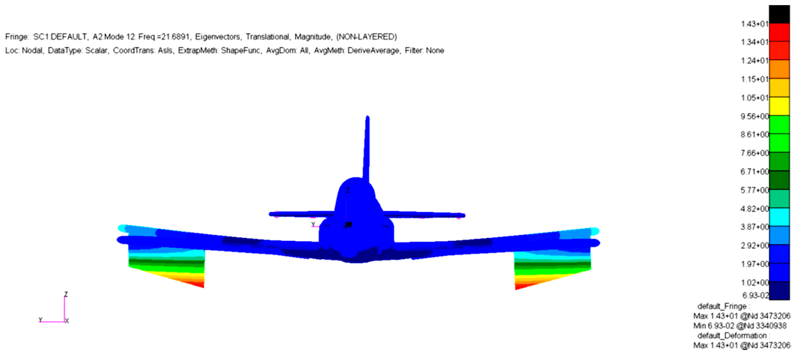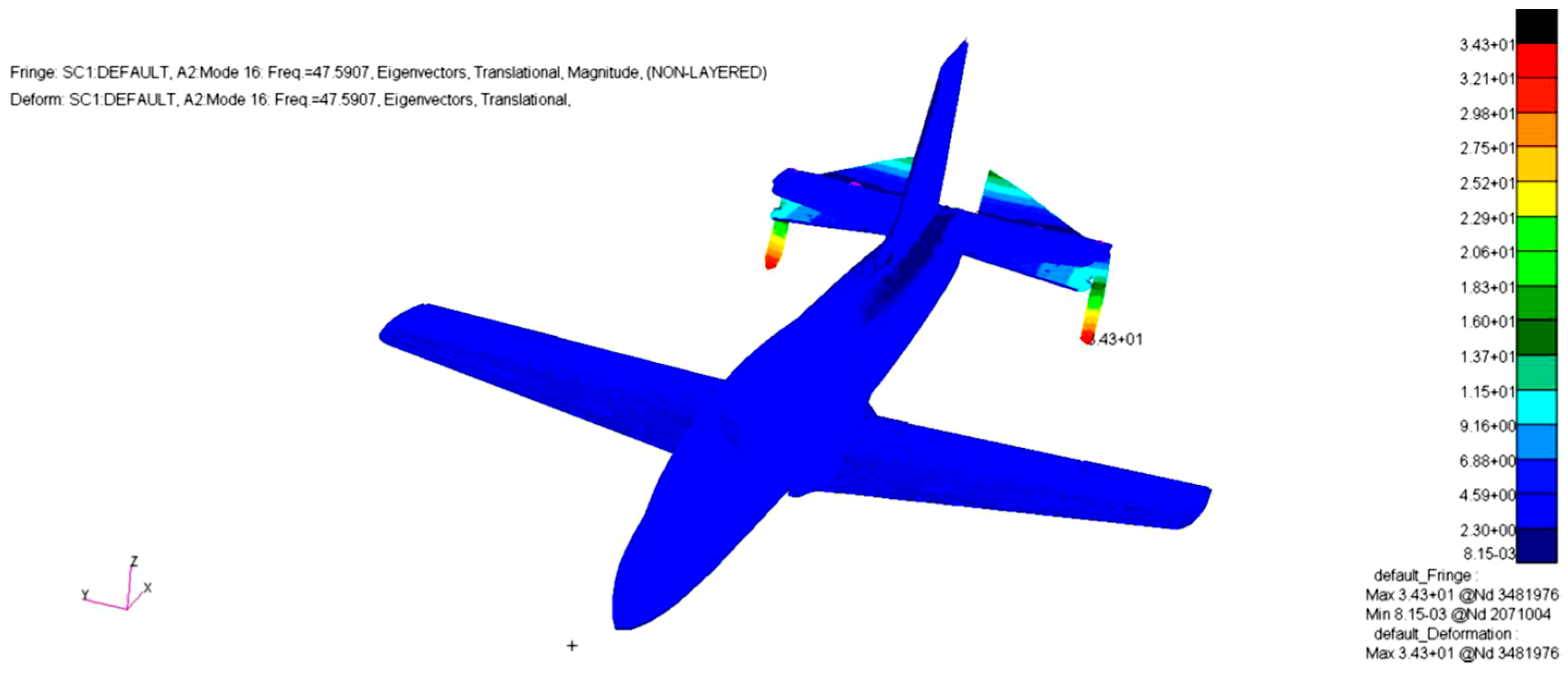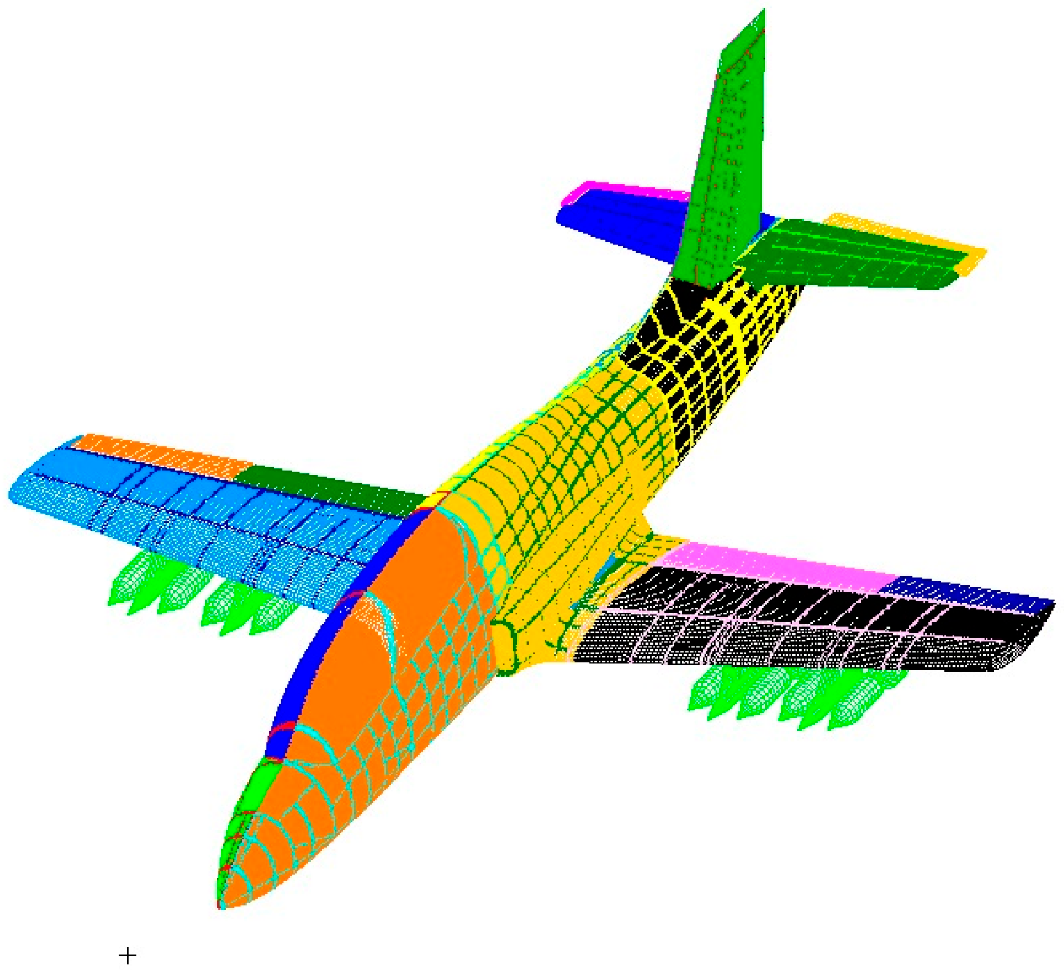 The structural model was verified under free–free boundary conditions to ensure the presence of the six rigid-body modes, and a WEIGHTCHECK audit (mass/C.G./inertia) was carried out to screen for inconsistencies in materials and element properties. The modal basis retained for aeroelastic coupling includes the fundamental elastic modes of wing and empennages as well as control surface modes.