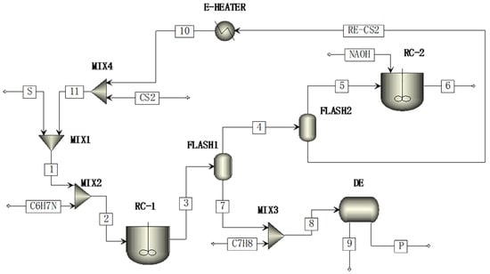 According to the production process of MBT, we programed the module process of MBT in Aspen Plus, as is shown in Figure 1 below. Firstly, the CS2 stream and S stream are mixed in the MIX1 model and then entered into the MIX2 model with the C6H7NS stream. After the three streams are combined, these materials turn into the RC-1 model to react. Secondly, we introduced the FLASH1 model to achieve initial vapor–liquid separation because the streams, after reacting, are not divided into a vapor phase and a liquid phase in the RC-1 model. Vapor-phase streams are cooled in the FLASH2 model through stream 4. After cooling, uncondensed H2S is absorbed in the RC-2 model using 32% NaOH solution, and the condensed S supplementary stream is mixed with the CS2 stream in the MIX4 model. The liquid-phase stream from the FLASH1 model with the C7H8 stream enter into the DE model (extraction kettle). Through extraction and purification, the product is sent to the next separation process through stream P, and waste liquid is disposed through stream 9.