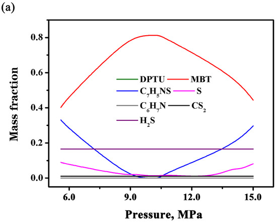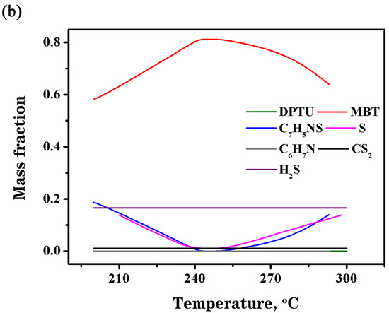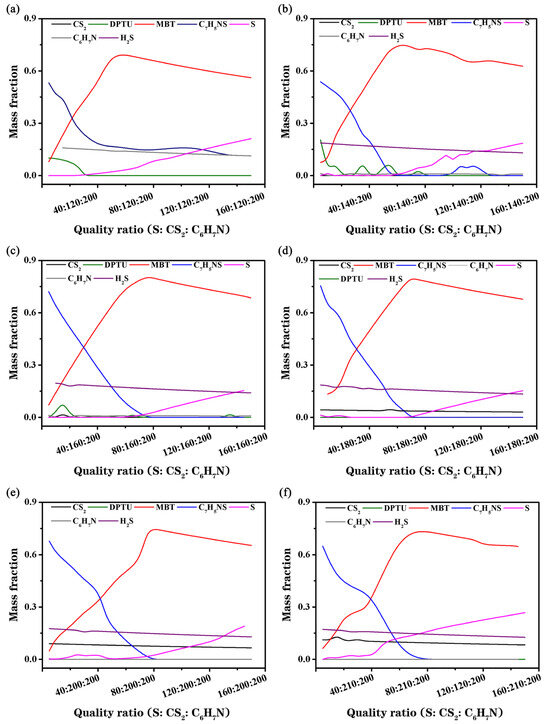 As shown in Figure 2, when the CS2: C6H7N ratio is constant, the mass fraction of MBT linearly increases at the beginning and gradually decreases after reaching the maximum level as the feed amount of S increases. Compared to MBT, the change in the C7H5NS mass fraction is completely converse before reaching the minimum level and, subsequently, C7H5NS is kept at a low amount. This phenomenon can be explained by the chemical equilibrium between MBT and C7H5NS [29]. At the beginning of the reaction, the hydrosulfonyl content in MBT is likely destroyed by the abundant S due to the large difference between the electronegativity of the S and C atoms [39]. When C7H5NS reaches the peak, the chemical equilibrium moves rightwards to promote the generation of MBT due to S. The other mass fractions, including those of H2S and C6H7N, decline slowly, while the mass fraction of DPTU, CS2 and S drop asymptotically to zero during this process. This is attributed to the fact that C6H7N and H2S are both by-products and reactants.