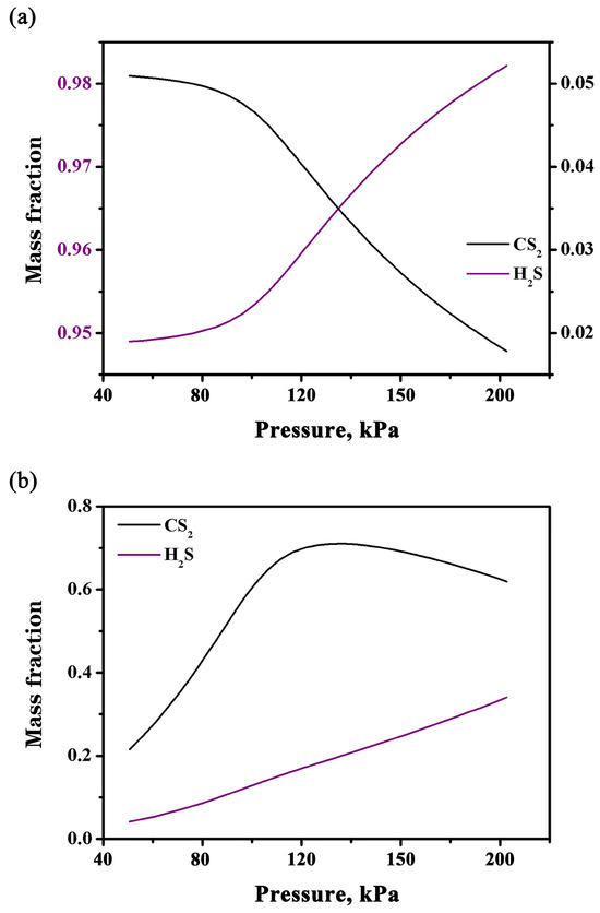 Figure 4a presents clearly that CS2 and H2S display a converse change as the condenser pressure rises, as was expected. Compared to the mass fraction of CS2 (right ordinate), H2S occupies over 95% of the volume in stream 5 (left ordinate). It is worth noting that the content curve, as shown in Figure 4b, has a significant effect, as shown in Figure 4a. Below 120 kPa pressure, the mass percentage of both CS2 and H2S appears to show an upward trajectory, apart from the difference in the slope of the curve. Then, the mass percentage of CS2 declines, while the mass percentage of H2S keeps increasing. In stream 10, the mass percentage of CS2 peaks at about 70%. The physical characteristics of CS2 show that the boiling point and saturated vapor pressure are 46.2 °C and 53.32 kPa (28 °C), respectively. Thus, the gaseous state of CS2 is subjected to pressure, which readily turns it into a liquid. When CS2 almost enters into a liquid stream (10) in the condenser, some of the H2S transforms into a liquid state, and this results in the proportion of CS2 reducing as the pressure increases. The reasons for this phenomenon will not be discussed in this paper.