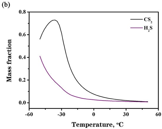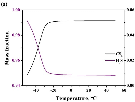 Variation in mass fraction of CS2 and H2S in stream 5 (a) and stream 10 (b), along with variation in condenser temperature from −50 °C to 50 °C.