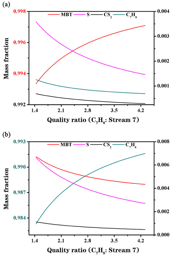 Variation in the mass percentage of MBT, S, CS2 and C7H8 with ratio of C7H8 and stream 7 in stream P (a) and stream 9 (b) of the extraction kettle outlet.