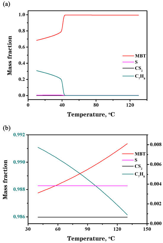 The variation in mass percentage of MBT, S, CS2 and C7H8 with increasing temperature in stream P (a) and stream 9 (b) of the extraction kettle outlet.