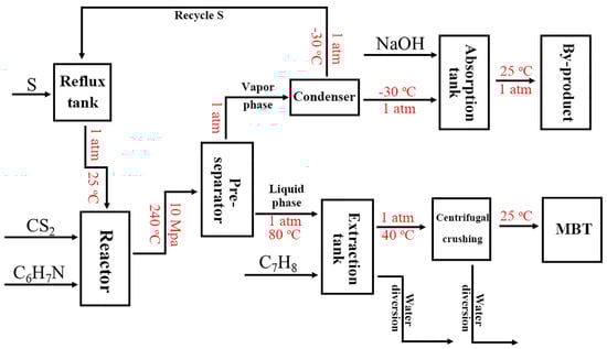 The experimental methods used to perform MBT synthesis are typically divided into two steps. Firstly, a synthesis reaction is conducted in an autoclave that is made of stainless steel [36] and which is filled with CS2 (315 L, 99%), S (140 kg) and C6H7N (378 L, 99%). This autoclave is able to withstand considerable pressure and temperature as it is equipped with a safety pressure relief valve and emergency cooling devices. Under the conditions of 255 °C and 9 MPa, about 98.5% crude MBT can be acquired after reacting for around 5 h. At the same time, H2S is also produced, and needs to be absorbed by a sodium hydroxide solution. Subsequently, crude MBT is extracted by C7H8 (2500 L, 99%) in an extraction reactor after about 4 h. The extraction reactor is composed of glass and steel equipment, and the temperature should be controlled within 65 °C. Via the two main steps described above, an MBT purity and yield of 99.1% and 87.5%, respectively, can be achieved. For the calculation, the E-factor is 1.7, the energy consumption is 0.47 t (standard coal)/t (production) and the reaction mass efficiency (RME) is 69%.