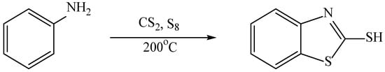 2-mercaptobenzothiazole (abbreviated as MBT) was first discovered by A. W. Hofmann when he prepared a disulfhydryl derivative of thiocarbanilide. As an early application, MBT was used as a vulcanization accelerator in the rubber industry by Bedford, Sebrell, Bruni and Romani [1]. Vulcanization accelerators can significantly shorten the vulcanization time of raw rubber at a moderate temperature. Considering the aging resistance of rubber articles, an accelerator (such as MBT) can ensure sufficient cross-linking of sulfur and rubber and reduce undesirable side reactions [2,3,4,5,6]. As studies focusing on MBT have increased, other scholars have discovered that MBT displays a high degree of corrosion inhibition by forming a thin protective film on metal surfaces, particularly copper, lead, aluminum and its alloys [7,8,9,10,11,12]. Meanwhile, the formation of specific-colored metal–MBT complexes in aqueous media has provided an important indicator for the spectrophotometric determination of copper, selenium, osmium, palladium and cadmium [13,14,15]. In addition to its previously mentioned applications, MBT is an important scaffold that is known to be associated with a wide range of biological activities. Derivatives of MBT are known to possess, among other traits, antimicrobial, antimycobacterial, antioxidant, radioprotective, fungicidal and antitumor qualities [16,17]. Although varied aspects of MBT have been presented in the literature, the synthesis mechanism of MBT and how to realize the industrial production of MBT through green and clean methods has rarely been reported.