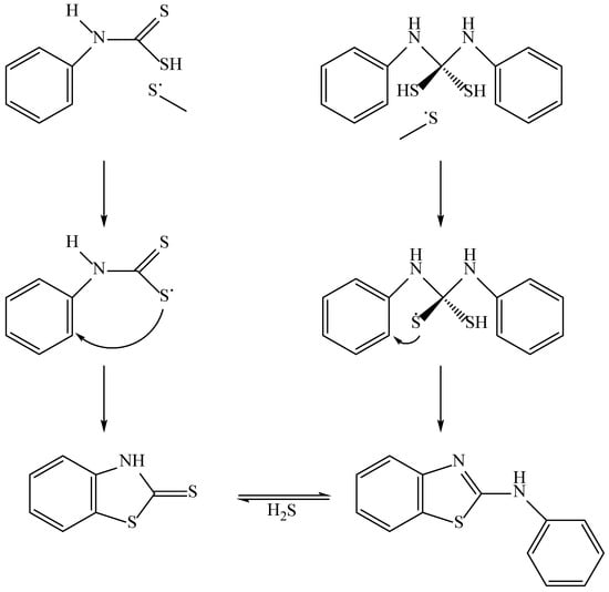 In spite of MBT’s various synthesis pathways, only the aniline method (using aniline as the main raw material) has been utilized in industrial production. The reaction principle is shown in Scheme 1. In this reaction, more than 50 by-products were identified by Isaacs and colleagues [27]. The tautomeric form of MBT (benzothiazoline-2-thione) is one of the by-products that can accompany the production of MBT. Koyama D. and Orr-Ewing A. J. demonstrated that the thione compounds’ form is strongly favored in both the gas and liquid (such as water) phases at room temperature [28]. In the presence of sulfur, benzothiazole (C7H5NS) was obtained as a by-product in the thermal degradation process of MBT; the mechanism of this is shown in Scheme 2 [27]. Louis Mina and colleagues thoroughly investigated C7H5NS as a by-product and found a likely equilibrium between C7H5NS and MBT [29]. In accordance with this discovery, MBT aniline method by-products may be incorporated as a starting material or recycled to enhance the yield of MBT. Moreover, in the main reaction, because of the incorporation of aniline and disulfide, phenylcarbamic acid and a tetrahedral substance are required as intermediates for the formation of MBT, which leads to the formation of a 2-anilinobenzothiazole (AnBTh) by-product (Scheme 3) [27]. This clearly shows that the excess hydrogen sulfide lies heavily in favor of MBT. Notably, the reaction can be conducted in the opposite direction when the nucleophilic power of the amine is increased (Scheme 4). In addition to the aforementioned by-products, other by-products, such as raw material residues and minor impurities, have not yet been described in detail.