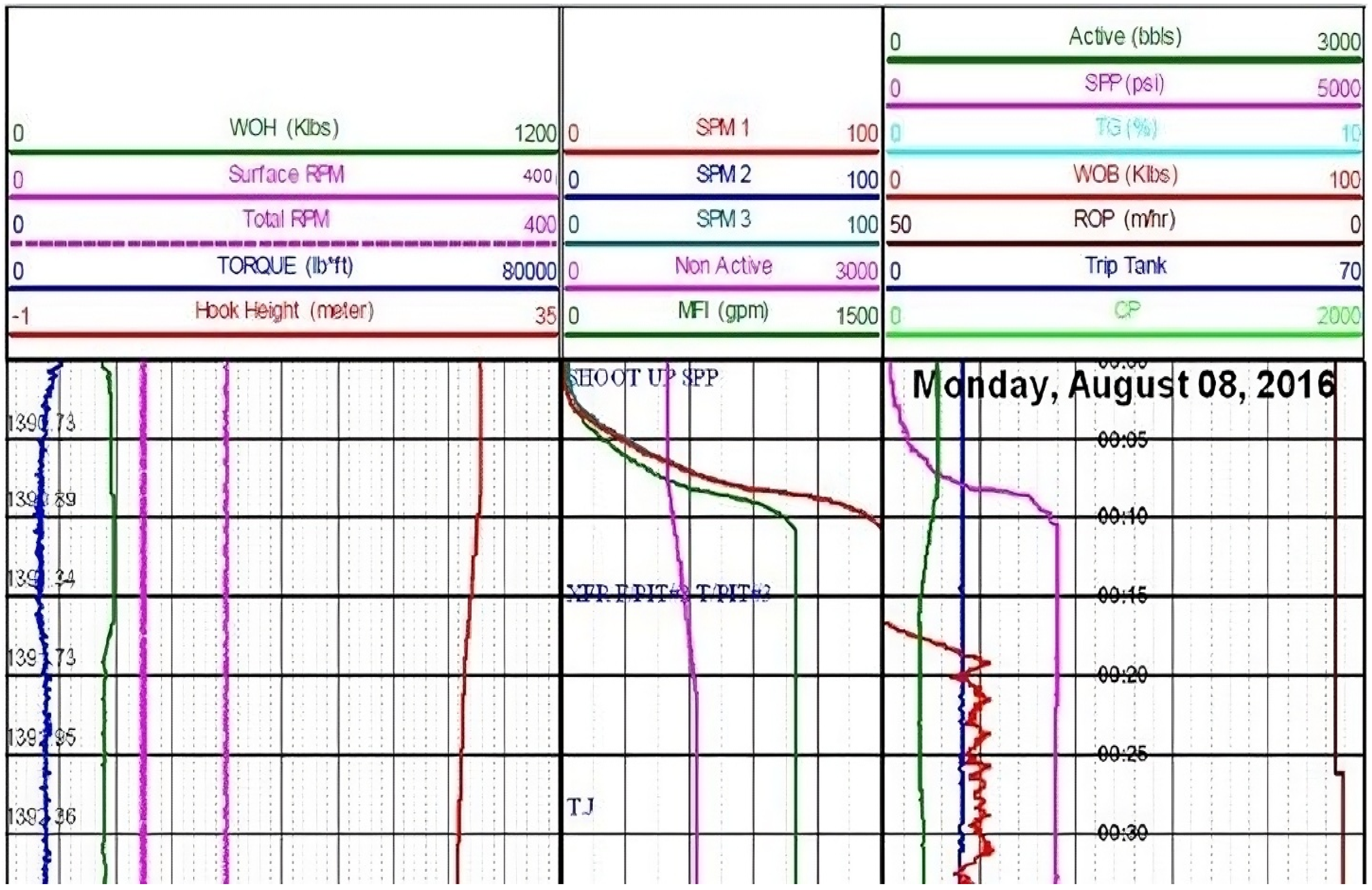 Mud logging data were analyzed to identify key operational constraints. At 1202 m, high torque spikes (TQ), elevated standpipe pressure (SPP), and intermittent string stalling were recorded (