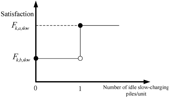 As shown in Figure 2, slow-charging users’ satisfaction with the CS planning is reflected in the availability of vacant slow-charging piles when they arrive, and if so, the satisfaction level is high; otherwise, the satisfaction level is low, as follows: