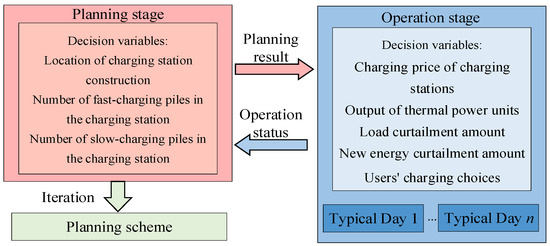 In the planning stage, the CS construction location and the number of fast- and slow-charging piles to be constructed in the power traffic coupling network are determined, so as to minimize the planning cost of the CS. Then, building on the planning results and actual operation schemes, optimal scheduling is conducted for the power-transport coupling network. This scheduling process identifies key operational parameters, such as the charging price of each CS under different schemes, the output of thermal power units, the amount of load curtailment, the volume of new energy curtailment, and the temporal and spatial charging choices of fast-charging and slow-charging users. Through this, the operating cost of the power-transport coupling network and the charging satisfaction of fast-charging and slow-charging users are optimized in an integrated manner.