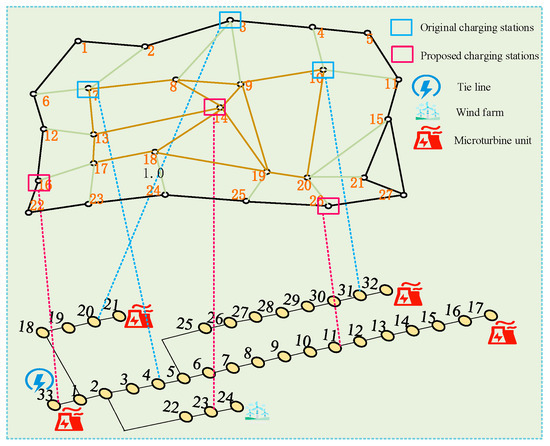 A fast-charging station planning model considering traffic and power constraints was proposed, with objectives including CS investment cost, distribution line cost, and substation expansion cost [4]; a fast CS location and capacity optimization model for EVs was established, aiming to maximize user-captured traffic flow and minimize investment cost [5]; dynamic traffic demand and user-balanced double-tier CS and DC fast-charging piles were considered in the highway network planning model, which also takes into account the operating cost of the distribution network under the cooperative operation of the transportation network (TN) and the electric network (EN) [6]; a traffic distribution model was established to optimize the location and capacity of CSs, considering the dynamic traffic flow of fuel vehicles and EVs [7]. All of the above studies are aimed at the operation and planning costs of the coupled electric transportation network, ignoring the needs of EV users for different types of CSs, and failing to realize the improvement of user satisfaction.