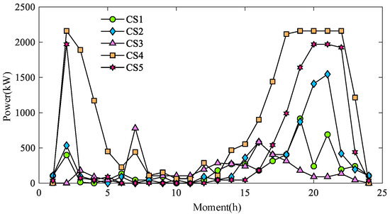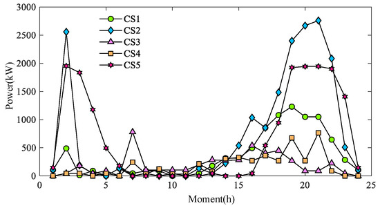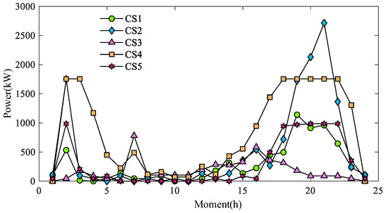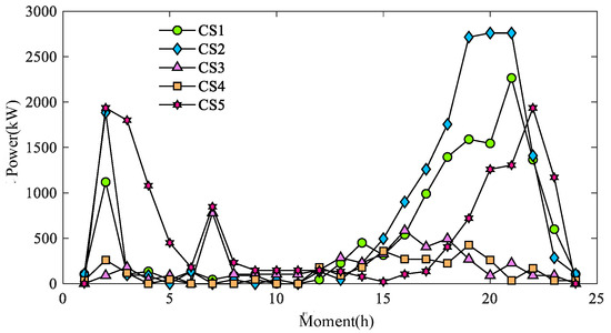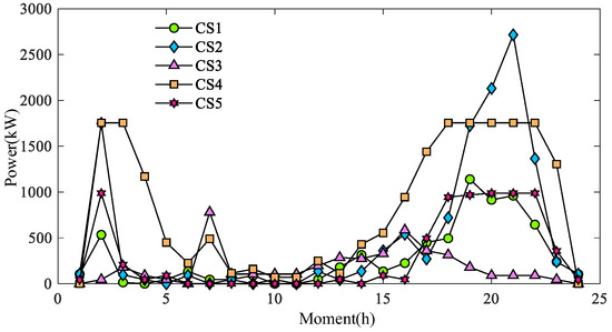Figure 18 and Figure 19 show the charging load of CSs for different schemes under a typical day, where CS1, CS2, CS3, CS4, and CS5 in Schemes c(1) and c(2) correspond to CSs at nodes 3, 7, 10, 14, and 16 of TN.