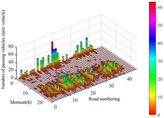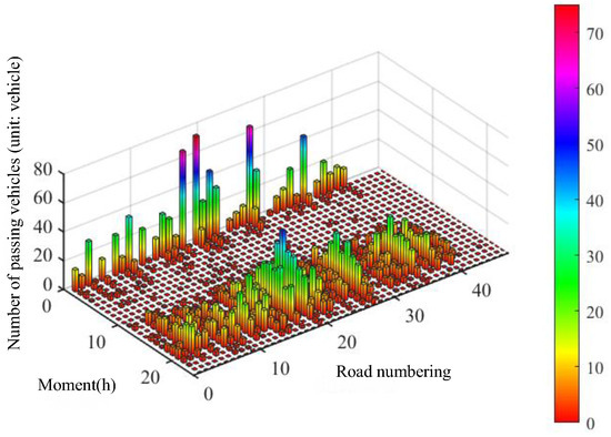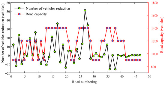 It is observed that the number of EVs passing by the vast majority of roads in 1 h decreased, while the number of EVs passing by a few roads increased. Among the 10 roads where the number of passing EVs increased, only 2 roads have a capacity of 900, 4 of the remaining 8 have a capacity of 1200, and the other 4 have a capacity of 1400. This indicates that differences in planning scenarios affect the users’ choice of CSs, which in turn changes their path of travel while charging, ultimately affecting traffic flow.