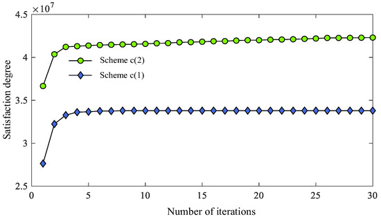 Figure 20 shows the improvement of comprehensive user satisfaction with algorithm iteration in the process of solving the optimal charging pile configuration after determining the planning location under different schemes. From the figure, it can be seen that compared with Scheme c(1), c(2) still improves user satisfaction at the later stage of iteration in the planning process. This is because compared with Scheme c(1), c(2) sets a larger satisfaction cost coefficient, and the solution algorithm proposed in this paper tends to select the sub-scheme that makes the biggest improvement in the comprehensive user satisfaction in each iteration round.