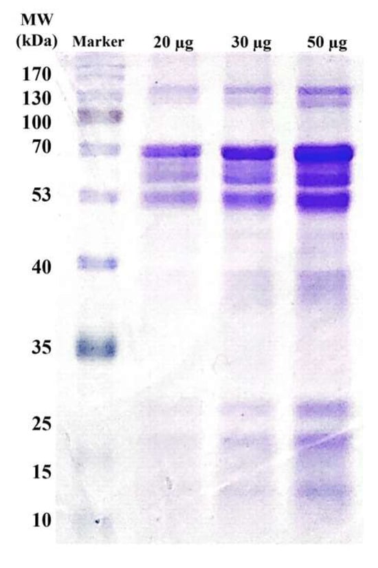 Protein extraction and precipitation from tree bean seed (TBS) powder yielded a dry tree bean seed protein (TBSP) mass equivalent to 30% of the total dry weight (29.9 g TBSP per 100 g TBS powder), consistent with previous reports [3]. The TBSP was analyzed by sodium dodecyl sulfate–polyacrylamide gel electrophoresis (SDS-PAGE) to examine its protein profile. The electrophoretogram (Figure 1) showed multiple distinct bands below 100 kDa, with the most prominent bands appearing between 53 kDa and 70 kDa. The intensity of these bands indicates that proteins within this molecular weight range are the major constituents of the extract. These findings are consistent with earlier studies reporting albumins and globulins (10–70 kDa) as the predominant storage proteins in P. timoriana [3,17] and with the high protein content previously described for tree bean seeds [18].