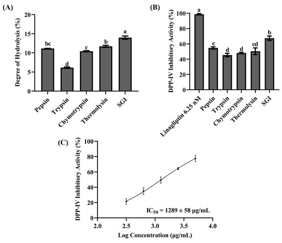 (A) Degree of hydrolysis (DH) and (B) DPP-IV inhibitory activity of tree bean seed protein hydrolysates (TBSPH). Values are expressed as mean ± SEM (n = 3). Bars with different letters indicate significant differences (p < 0.05) within each group. (C) Half-maximal DPP-IV inhibitory concentration (IC50) of the TBSP SGI hydrolysate.