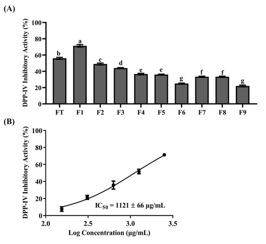 DPP-IV inhibitory activity was evaluated at 2.5 mg/mL with 6.25 nM linagliptin as a positive control. Fraction F1 exhibited the highest inhibitory activity (Figure 3A) and was further analyzed for IC50 values, yielding 1121 ± 66 µg/mL (Figure 3B), which was lower than that of the unfractionated SGI hydrolysate, indicating enrichment of active peptides.