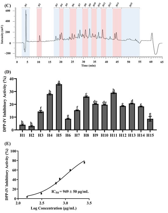 (A) DPP-IV inhibitory activity of SCX fractions, (B) IC50 value of SCX fraction F1, (C) RP-HPLC chromatogram of SCX fraction F1, (D) DPP-IV inhibitory activity of RP-HPLC fractions, and (E) IC50 value of RP-HPLC fraction H5. Values are presented as mean ± SEM (n = 3). Bars with different letters indicate significant differences within each group (p < 0.05).