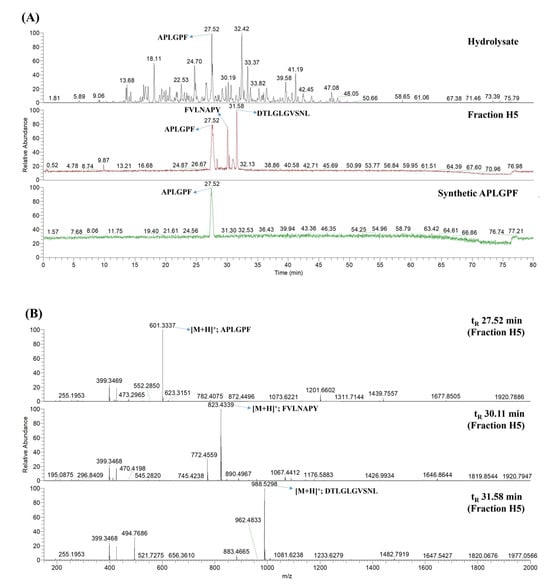 The most active RP-HPLC fraction (H5) obtained from the two-step sequential fractionation was analyzed by LC-MS/MS using an LTQ-Orbitrap XL to identify peptides with potential DPP-IV inhibitory activity. Sequential fractionation progressively reduces peptide mixture complexity, thereby enriching bioactive candidates. As shown in Figure 4A, the chromatographic profiles of the hydrolysate and the H5 fraction revealed a markedly reduced number of peaks, reflecting decreased sample complexity. From the high-intensity peaks in H5, three peptides were identified: APLGPF (m/z 601.3337; top panel), FVLNAPY (m/z 823.4339; middle panel), and DTLGLGVSNL (m/z 988.5298; bottom panel) (Figure 4B). Moreover, in silico assessment indicated that these peptides are non-toxic and non-allergenic.