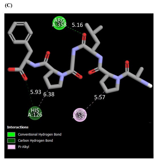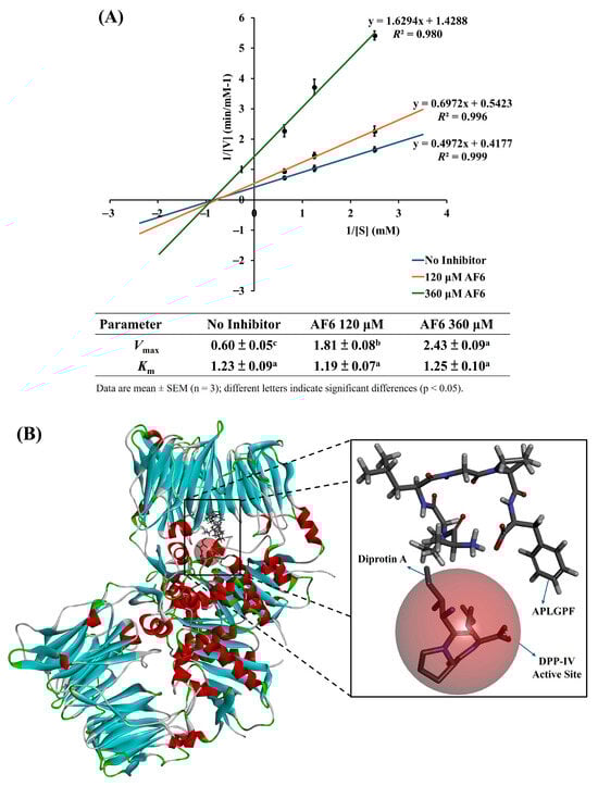 The inhibitory mode of AF6 against DPP-IV was evaluated using Lineweaver–Burk analysis (Figure 5A). The plots revealed that increasing concentrations of AF6 (120 and 360 μM) altered the y-intercept without affecting the x-intercept, indicating a non-competitive inhibition pattern. This suggests that AF6 binds to a site distinct from the enzyme’s active site, reducing catalytic efficiency without influencing substrate binding. Interestingly, Hung et al. [31] reported a hexapeptide containing Ala1-Pro2 at its N-terminus that also exhibited non-competitive inhibition, supporting the relevance of this structural motif in allosteric binding. To further elucidate the molecular basis of AF6–DPP-IV interactions and confirm the potential allosteric binding mode, molecular docking simulations were subsequently performed.