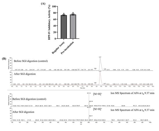 (A) AF6 stability against DPP-IV Pre-incubation. Values are presented as mean ± SEM (n = 3). Bars with different letters indicate significant differences within each group (p < 0.05). (B) LC-MS chromatogram of AF6 before and after SGI digestion (top panel) and ion MS spectrum of AF6 before and after SGI digestion (bottom panel).