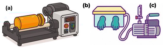 (a) High-speed horizontal ball mill, (b) glove box, and (c) vacuum pump used during processing.
