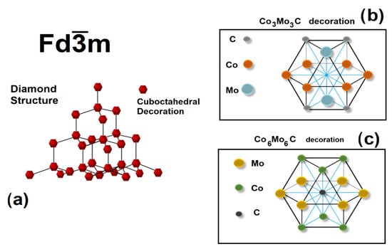 Space group (No. 227): (a) crystal framework with cuboctahedral decoration; (b) structural motif for C; (c) decoration for C.