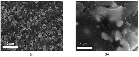 Sample M2: SEM morphology after 26 h of vibration assisted milling. (a) Low-magnification view showing a flake-dominated powder formed by repeated cold welding and fracture (scale bar: 10 µm). (b) Higher-magnification view resolving stacked lamellae and small fragments on the platelets, consistent with enhanced fragmentation and layer sliding (scale bar: 1 µm).