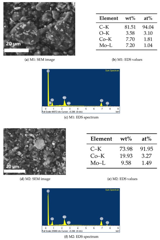 Local composition was assessed by SEM–EDS on representative fields (Figure 6). The EDS spectra in Figure 6c and Figure 6f were acquired in area mode, integrating over the full SEM frames shown in Figure 6a and Figure 6d, respectively. For M1 (Figure 6a–c), the semi-quantitative analysis indicates a carbon-rich matrix with minor cobalt and molybdenum and a small oxygen signal (C 81.51 wt%/94.04 at%; O 3.58 wt%/3.10 at%; Co 7.70 wt%/1.81 at%; Mo 7.20 wt%/1.04 at%), likely due to superficial oxidation or adsorbed species upon air exposure. For M2 (Figure 6d–f), higher relative metal contents are measured (C 73.98 wt%/91.95 at%; Co 19.93 wt%/3.27 at%; Mo 9.58 wt%/1.49 at%), consistent with more intimate mixing between metallic and carbonaceous constituents under vibration-assisted conditions. Given the powders’ rough, porous surfaces and the low accelerating voltage used (see Section 2), the EDS values are interpreted comparatively rather than absolutely.