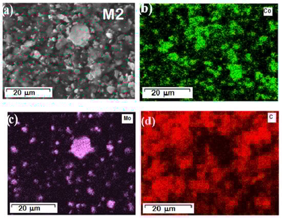 Elemental maps for sample M1. (a) SEM micrograph reproducing the same field of view as Figure 6a; (b) carbon (C K1) map, showing a continuous carbon background; (c) cobalt (Co K1) map, with finely dispersed Co domains; (d) molybdenum (Mo L1) map, highlighting micron-scale Mo-rich islands. The distribution indicates incomplete alloying under the lower-energy condition. Scale bar: 20 µm.