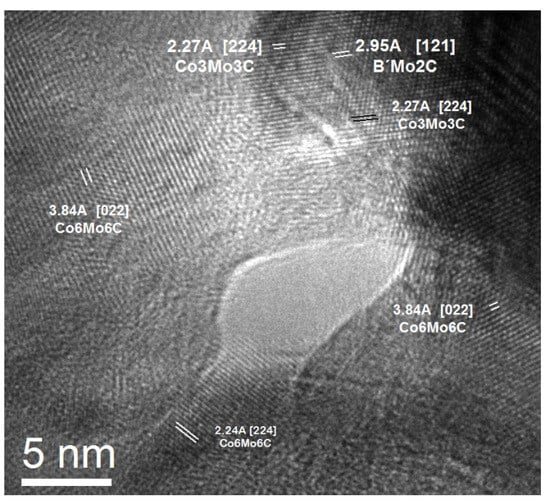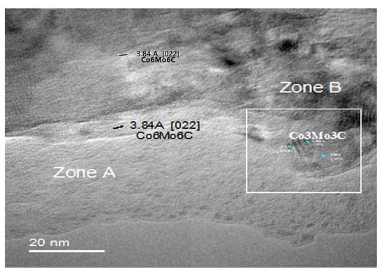 Figure 9 shows a representative BF-TEM micrograph from M2. The field of view contains thin stacked lamellae (thin layers) decorated by small clusters and nanoparticles. Two areas are marked: Zone A, dominated by extended lamellae indexed to C (space group ), and Zone B, a small domain with clear Moiré fringe contrast consistent with C (). Many clusters sit on the lamellae; in these BF images, their internal order is insufficient to permit definitive structural assignment by HRTEM alone. Based on the XRD results, these clusters may be fragments of the intermetallics and and of the cobalt monocarbide C; confirmation would require local diffraction or atomic-resolution STEM.