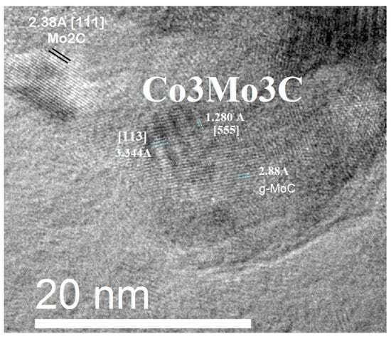 Catalytic studies on TMCs span several reactions. In ammonia synthesis, composition and temperature, rather than crystal structure, were identified as the most influential variables. Cobalt and carbon play central roles through exchange between carbon and nitrogen. In that context, C showed limited activity until it transformed into N at 500 °C [3]. For methane decomposition, cobalt and molybdenum -carbides have also been reported as active phases [4]. In parallel, chemical routes followed by heat treatment have produced (Co, Mo, W) carbide nanoparticles, whose distinction between C and C can only be resolved using high-resolution imaging [5].