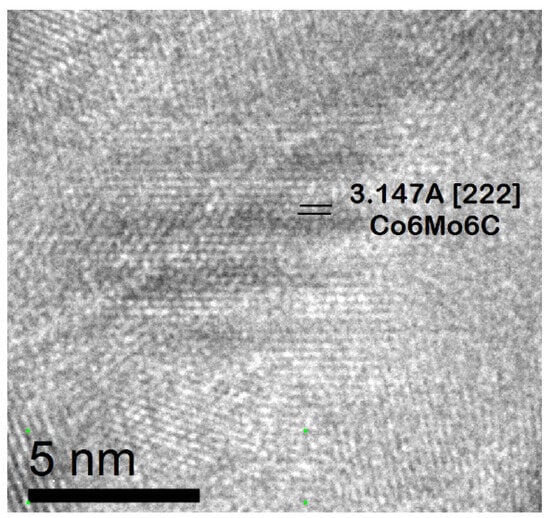 A higher-magnification view of the Moiré nanoparticle is presented in Figure 10. In mechanically alloyed lamellar aggregates, repeated stacking, intercalation, and compaction of thin crystalline sheets are common. Local misorientation between overlapping lattices produces Moiré interference patterns, that are well documented in layered materials [33]. Around the C domain, other lamellae can be indexed to monocarbides: C with (No. 225, Å) and -MoC with ( Å, Å), consistent with local polymorphism in C-rich Mo phases under nonequilibrium processing. Representative d-spacings are annotated and match the PDF values.