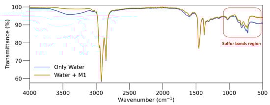 Figure 14 compares only water and water + M1 after aquathermolysis at 100 °C for 4 h. The water only trace shows attenuation of the sulfur-related bands, quantified in Table 4. Under the same conditions, the water + M1 overlay shows reductions of similar size (Table 5). Prior studies report that lower catalyst loadings generally require longer times and possibly higher temperatures [10,11,22]. Longer treatments would likely be needed to reveal the intrinsic activity of M1 in this setup.