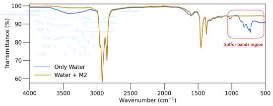 We tested whether the materials produced here can help desulfurize high-viscosity heavy crude by conducting catalytic aquathermolysis. Three samples were prepared: a reference with equal masses of distilled water and heavy crude (only water); and two catalytic runs where equal masses of water and crude were treated with catalyst M1 or M2 at 1 wt% relative to the water + crude mass (water + M1 and water + M2). All samples were heated at 100 °C for 4 h in the water-bath reactor described in Section 2, after which samples were analyzed by ATR-FTIR. We focus on the 500– region, which contains characteristic bands of sulfur-containing groups in hydrocarbons [40,41]. Table 3 summarizes the assignments used.