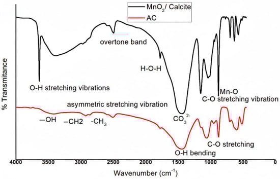 2.3. Characterization of MnO2/Calcite Nanocatalyst and AC