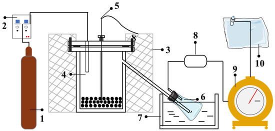 The produced volatile products were entrained by the carrier gas and passed through a conical flask immersed in a tank filled with ice and water. Most of the tar and water were condensed in the flask; the remaining part was retained and absorbed by a tube filled with silica gel and cotton. The volume of gas was recorded by a wet gas flow meter (LMF-1, Alpha, Changchun, China) and then collected in a sampling bag for gas chromatography analysis. When the set experiment time was over, the furnace was turned off and the reactor was cooled to room temperature. The semicoke mass was weighed after disassembling the device. The mass difference between the collection bottle before and after the reaction produced the tar–water mixture. Water and tar were separated by centrifugation, and the quantity of the water and tar was determined. The quantity of pyrolysis gas was obtained by difference. The yield of the product can be calculated based on the mass of the raw coal sample and the mass of the resulting product.